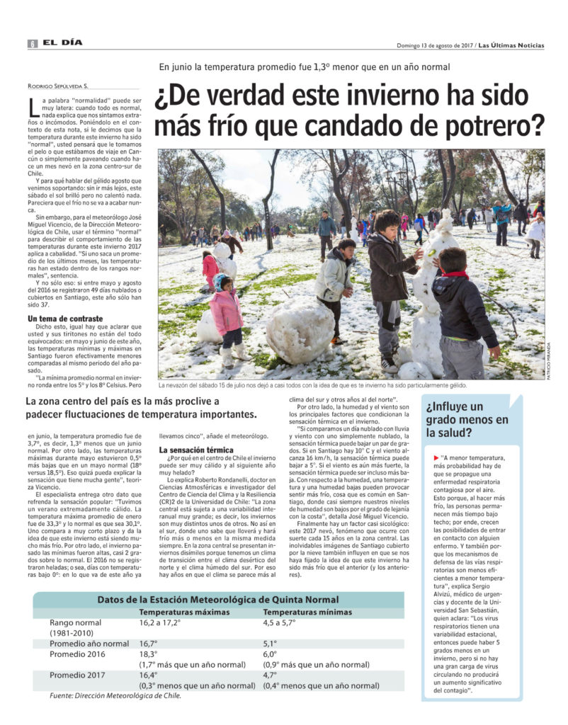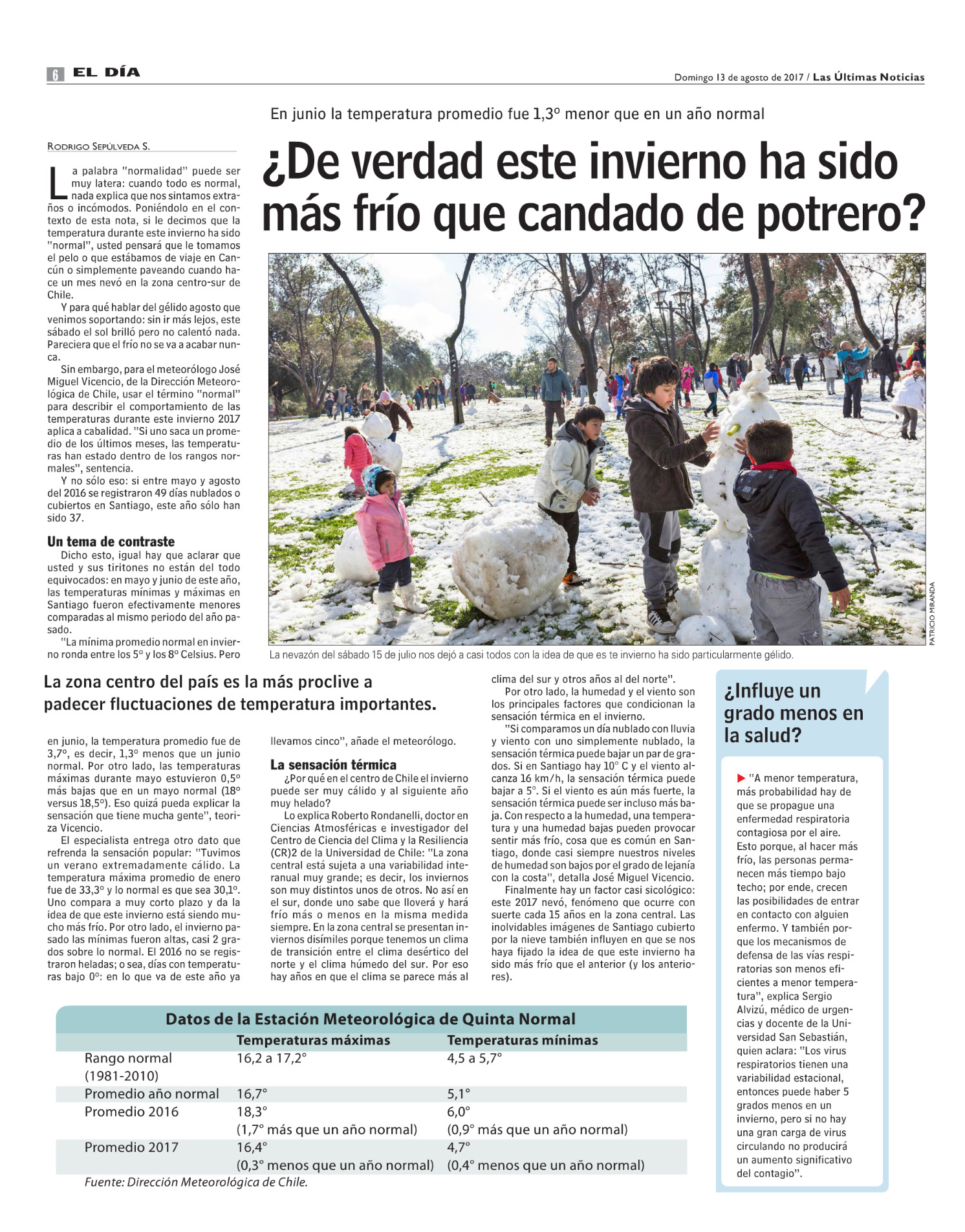 Sin embargo, para el meteorólogo José Miguel Vicencio, de la Dirección Meteorológica de Chile, usar el término «normal» para describir el comportamiento de las temperaturas durante este invierno 2017 aplica a cabalidad. «Si uno saca un promedio de los últimos meses, las tempertaturas han estado dentro de los rangos nomales», sentencia.