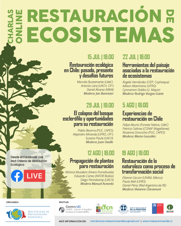 La Red Chilena de Restauración Ecológica los invita a participar de una serie de charlas con destacados e importantes investigadores en Chile sobre la restauración de ecosistemas a nivel nacional. Estas serán trasmitidas en vivo todos los miércoles a partir del 15 de julio hasta el 19 de agosto a las 18 horas.