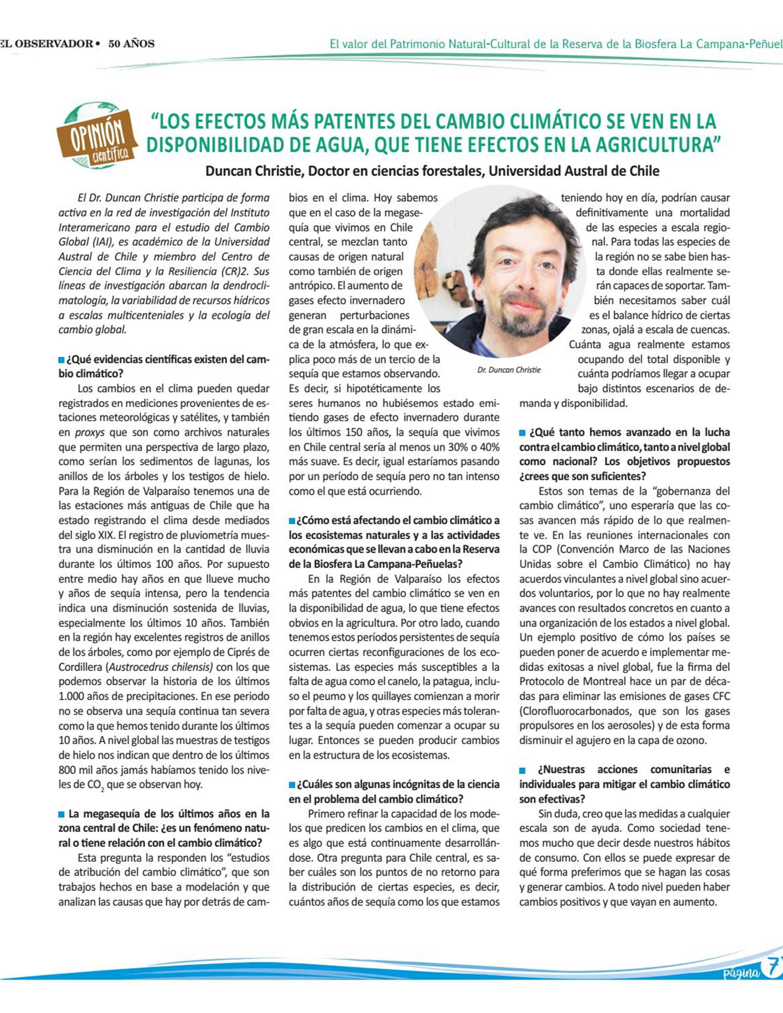 El Dr. Duncan Christie participa de forma activa en la red de investigación del Instituto Interamericano para el estudio del Cambio Global (IAI), es académico de la Universidad Austral de Chile y miembro del Centro de Ciencia del Clima y la Resiliencia. Sus líneas de investigación abarcan la dendroclimatología, la variabilidad de recursos hídricos a escalas multicenteniales y la ecología del cambio global.
