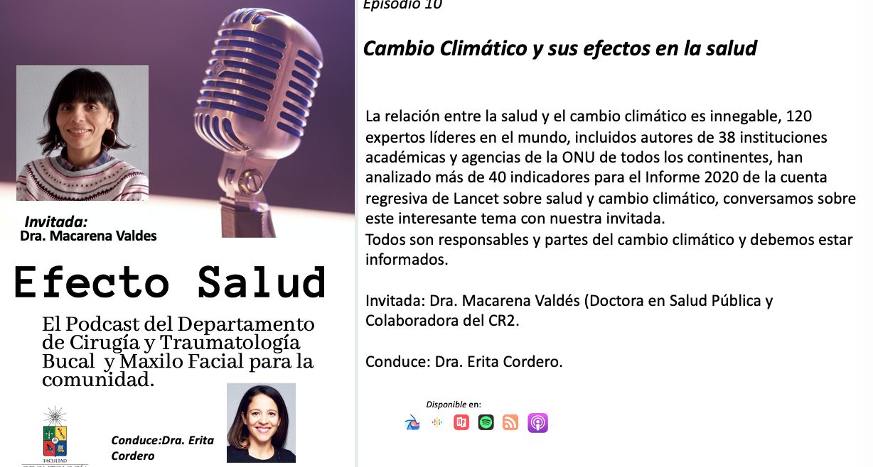 La relación entre la salud y el cambio climático es innegable, 120 expertos líderes en el mundo, incluidos autores de 38 instituciones académicas y agencias de la ONU de todos los continentes, han analizado más de 40 indicadores para el Informe 2020 de la cuenta regresiva de Lancet sobre salud y cambio climático, conversamos sobre este interesante tema con nuestra invitada Macarena Valdés, investigadora del (CR)2 y académica de la Escuela de Salud Pública de la Universidad de Chile.