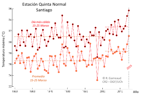 La figura adjunta muestra para la estación Quinta Normal (Santiago) el promedio de la temperatura máxima y el valor máximo considerando el periodo 15 al 25 de marzo de cada año entre 1950 y 2015(*). Es importante destacar que los valores del presente año no son los máximos del registro sino que también se insertan en una clara tendencia al alza de temperaturas que comienza hace varias décadas.