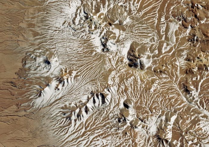 Una poco frecuente nevada cayó sobre el desierto de Atacama entre el 25 y el 26 de junio pasado, siendo la más intensa en 10 años. Esta imagen correponde al 10 de julio, donde gran parte de la nieve caída se mantenía sobre la superficie. Imagen: NASA