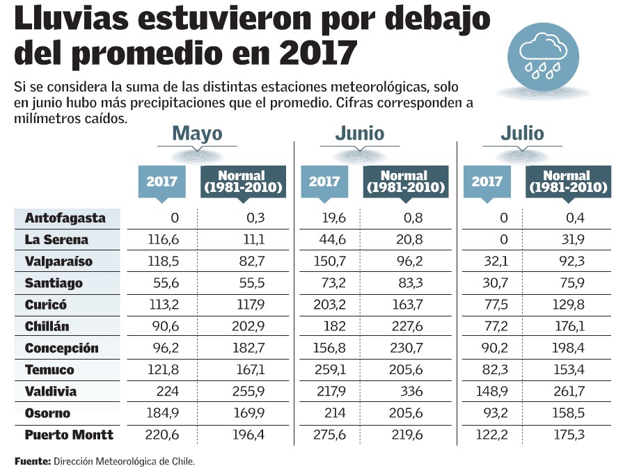 Aunque podrían interpretarse como una buena señal para lo que vendrá en los próximos meses, las lluvias de la semana pasada en buena parte de la zona central no serían el anticipo de un invierno con abundantes precipitaciones, aun cuando confirman que el fenómeno de La Niña -que tuvo como consecuencia un verano y otoño secos en gran parte de Chile- estaría en retirada.