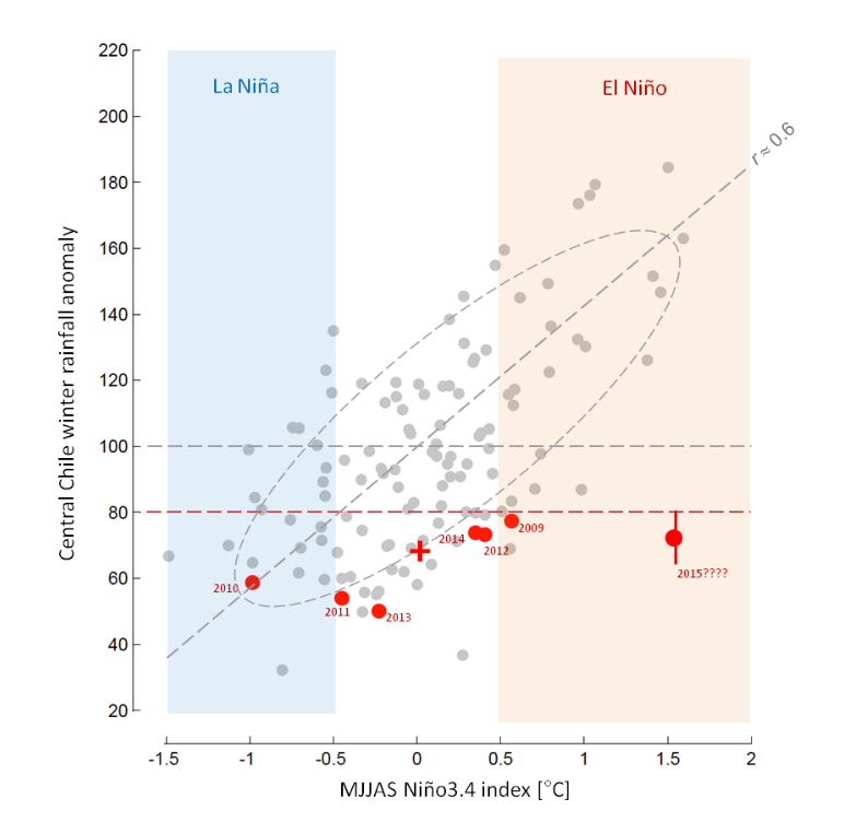 Figura 1. Diagrama de dispersión entre el índice Niño 3.4 (meses de invierno) y las anomalías de precipitación en Chile central (compuesto estaciones Santiago, Curicó y Chillán). Período 1900-2015.