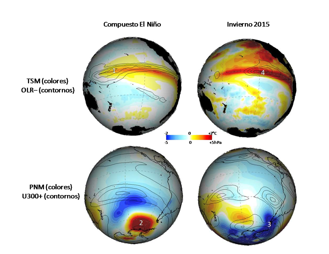 No es claro porque las anomalías de PNM (o presión en cualquier otro nivel de la troposfera) en latitudes medias durante el 2015 son tan distintas a las esperadas durante un año de El Niño. Una posibilidad a explorar es la ubicación de la convección sobre el Pacífico tropical que este año han estado muy al este de la posición esperada en una condición de El Niño (compare 4 con 1), tal vez en respuesta al rápido y marcado calentamiento que ocurrió durante otoño en al Pacífico oriental cerca de la costa de Sudamérica.