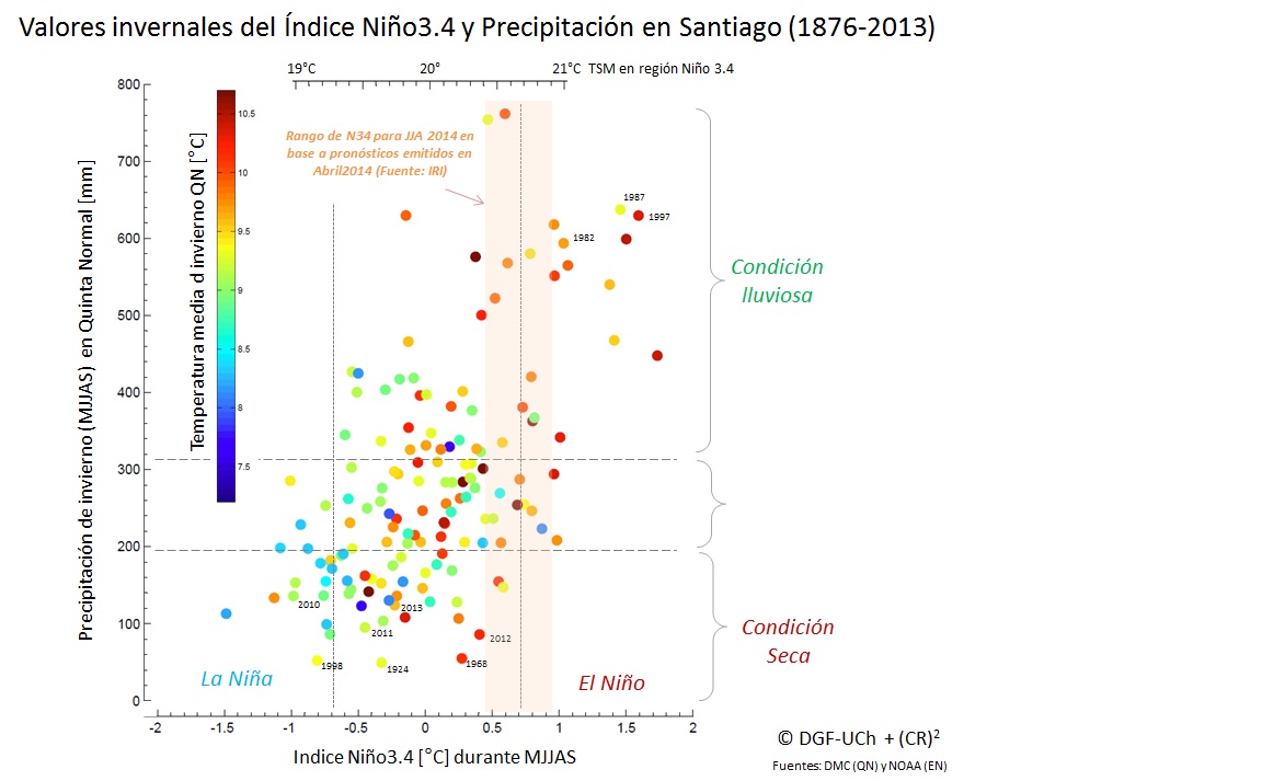 Relación entre fases del fenómeno “El Niño” y la precipitación en Chile central. Para cada invierno (Mayo-Septiembre) entre 1876 y 2013 el circulo indica el valor observado del índice Niño3.4 (anomalías de TSM en Pacífico centra ecuatorial, eje horizontal) y la precipitación en Quinta Normal-Santiago (eje vertical). El color del circulo indica la temperatura media durante el invierno. Fuente de datos: DMC (Quinta Normal) y NCEP (Niño3.4)