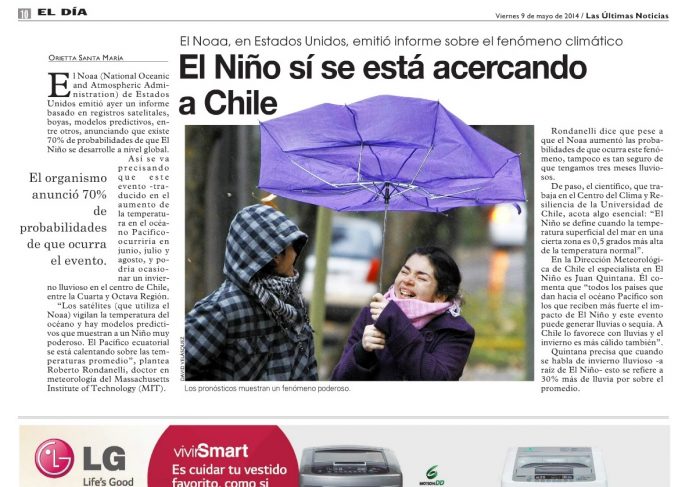 En la Dirección Meteorológica de Chile el especialista en El Niño es Juan Quintana. Él comenta que “todos los países que dan hacia el océano Pacífico son los que reciben más fuerte el impacto de El Niño y este evento puede generar lluvias o sequía. A Chile lo favorece con lluvias y el invierno es más cálido también”.