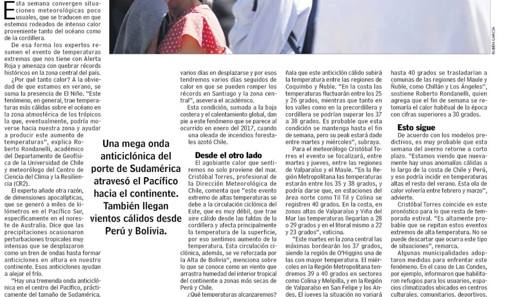 Agua y ExtremosIncendios forestales El origen del calor extremo: vientos cálidos atacan al mismo tiempo desde el mar y la cordillera (LUN) 30 de enero de 2024 1040 Recién el fin de semana habrá temperaturas más soportables, en torno a los 30 grados, en la zona central.