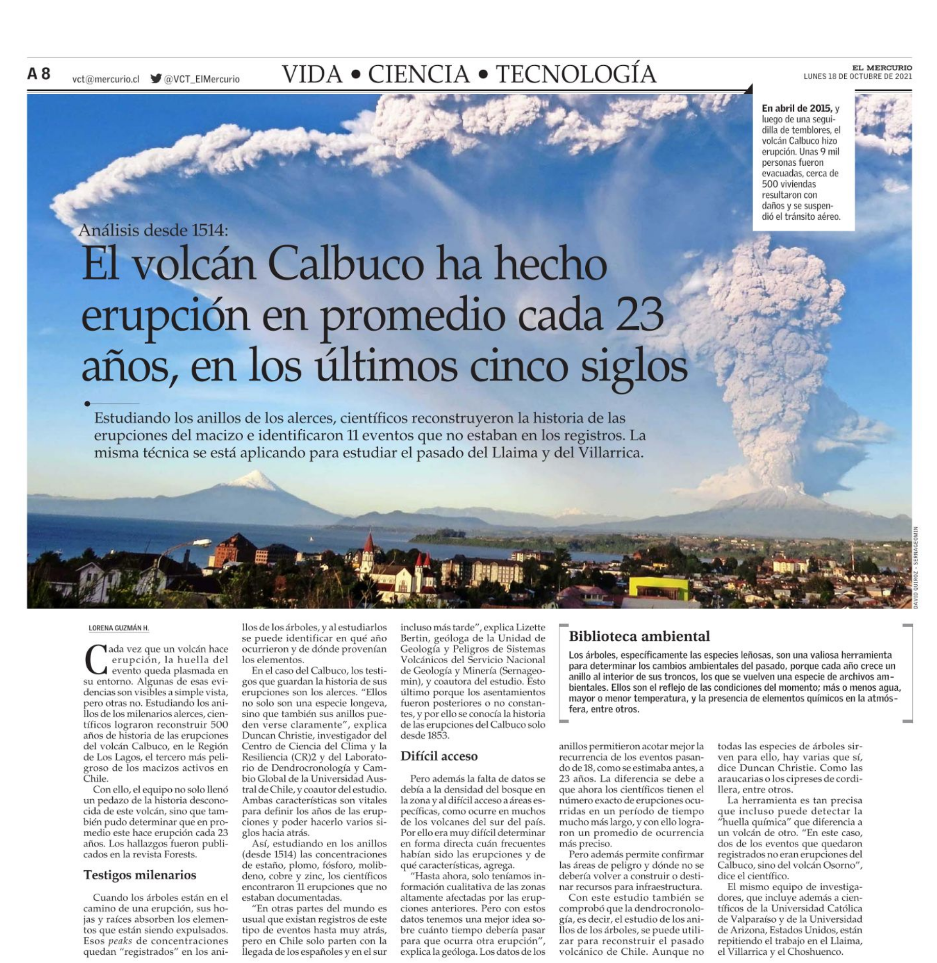 Cada vez que un volcán hace erupción, la huella del evento queda plasmada en su entorno. Algunas de esas evidencias son visibles a simple vista, pero otras no. Estudiando los anillos de los milenarios alerces, científicos lograron reconstruir 500 años de historia de las erupciones del volcán Calbuco, en la Región de Los Lagos, el tercero más peligroso de los macizos activos en Chile.