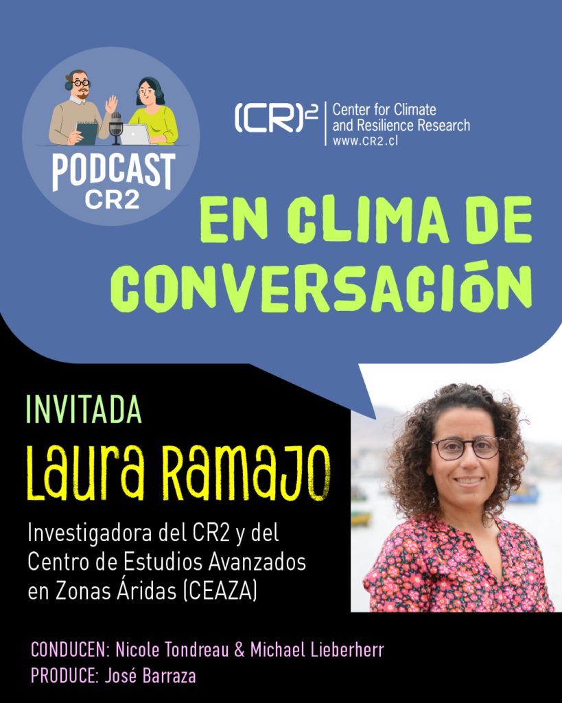 En nuestro primer capítulo conversamos con Laura Ramajo, especialista en riesgos climáticos, investigadora titular del Centros de Estudios Avanzados en Zonas Áridas (CEAZA), investigadora adjunta del Centro de Ciencia del Clima y la Resiliencia (CR)2, y autora líder del último informe del IPCC sobre impactos, adaptación y vulnerabilidad.