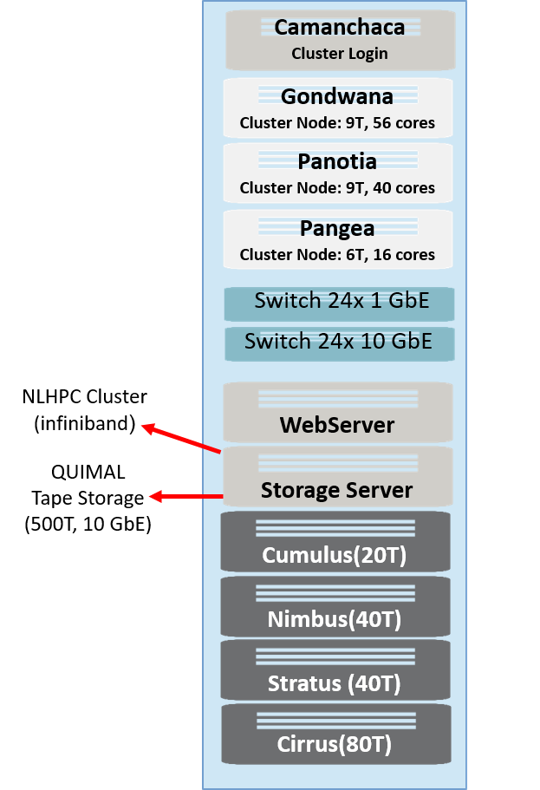 - Rocks Cluster Frontend: Camanchaca. Dell PowerEdge 2950, 8 cores Intel Xeon CPU X5450, 8G RAM, storage 2.4 TeraBytes