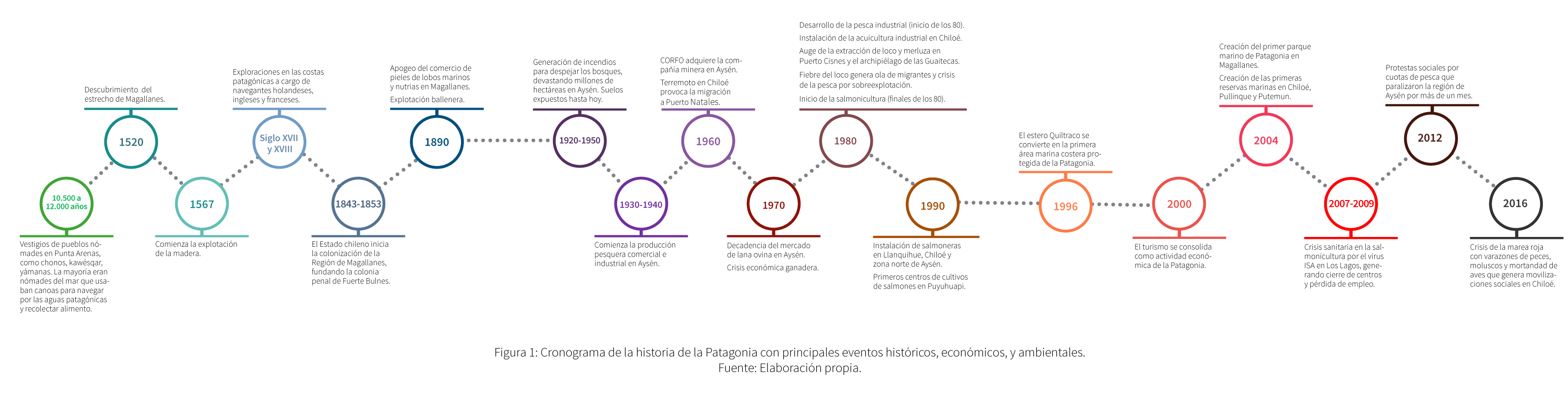 La compleja geografía, el clima hiperhúmedo y el acceso a los recursos, han sido factores determinantes para el asentamiento y expansión del ser humano en la zona. A lo largo de la historia los principales cambios demográficos registrados en la Patagonia han estado asociados a la explotación de los recursos naturales disponibles. Tras la llegada de las primeras exploraciones europeas en el siglo XVI y la colonización española, el desarrollo de actividades económicas como la explotación forestal y la caza de lobos marinos, nutrias y ballenas (s. XVII al XIX), seguido de la ganadería latifundista (s. XIX), supusieron un impulso económico para la zona, con un incremento de la población atraída por este auge (WWF Chile, 2011; Quiroz, 2020; Sepúlveda & Lara, 2021) (ver Figura 1). Sin embargo, estas actividades produjeron un gran impacto para los pueblos originarios, los cuales sufrieron genocidio y persecución a mediados del siglo XIX, llevándolos a la esclavitud y el aislamiento, y viéndose forzados a cambiar su estilo de vida nómada. A pesar de todo ello, los pueblos originarios han sido parte fundamental en la construcción de la sociedad y del territorio como lo entendemos en la actualidad.