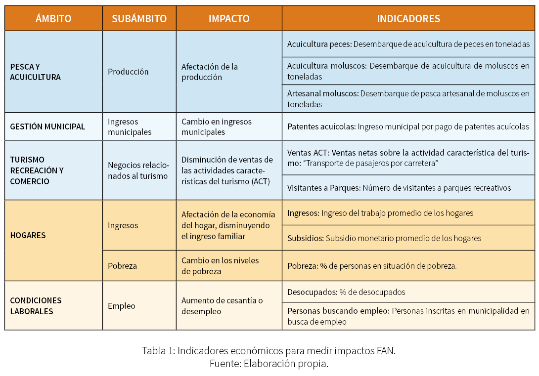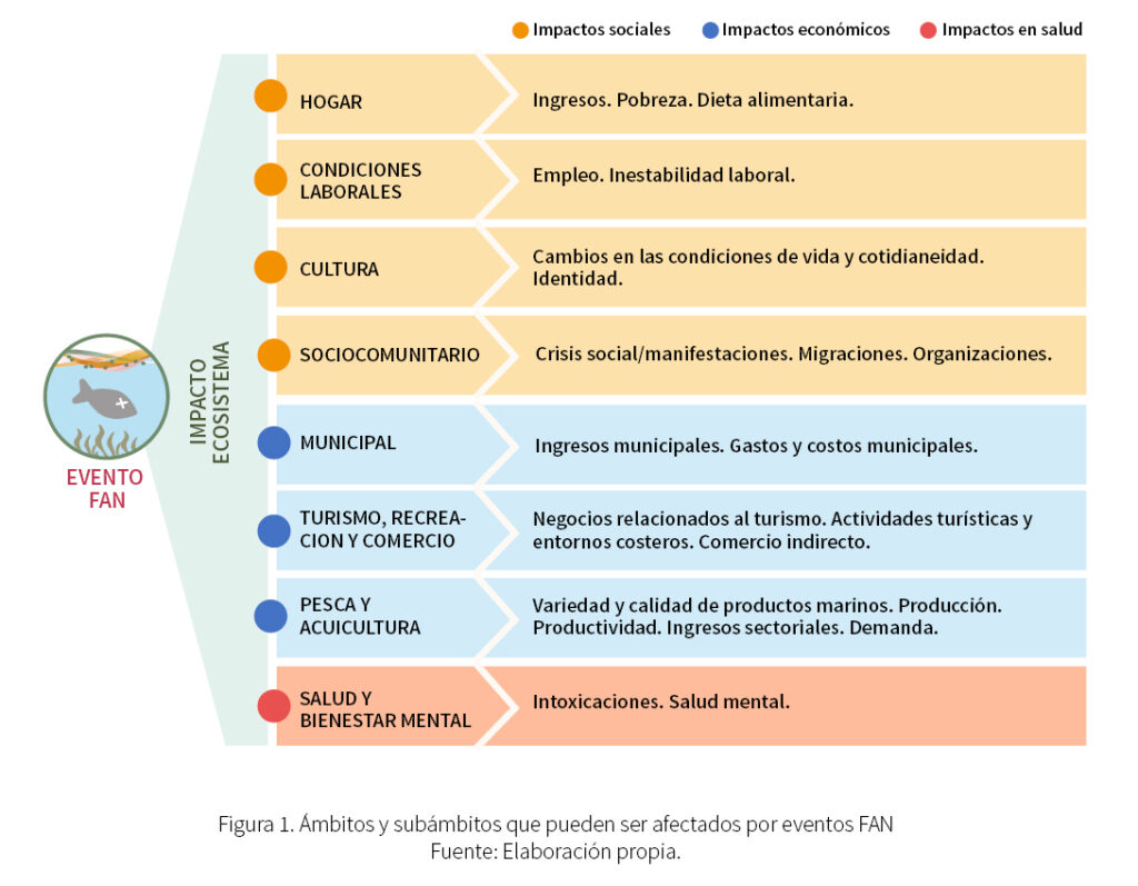 A partir de la experiencia documentada en Chile y a nivel internacional, así como de entrevistas y encuestas realizadas en la Región de Los Lagos, se han identificado ocho ámbitos que pueden verse afectados por eventos de FAN (ver Figura 1): cuatro relacionados a impactos sociales, tres económicos, y uno de salud y bienestar. Dentro de estos ocho ámbitos se reconocen veintidós subámbitos, y en estos últimos puede haber uno o más impactos, por lo que el total de impactos sociales, económicos y en salud identificados llegan a sesenta.