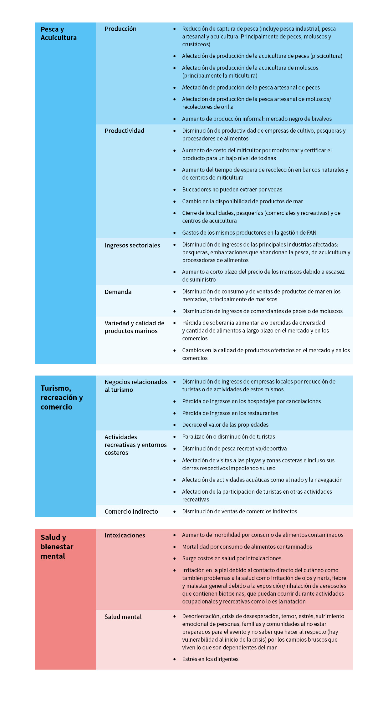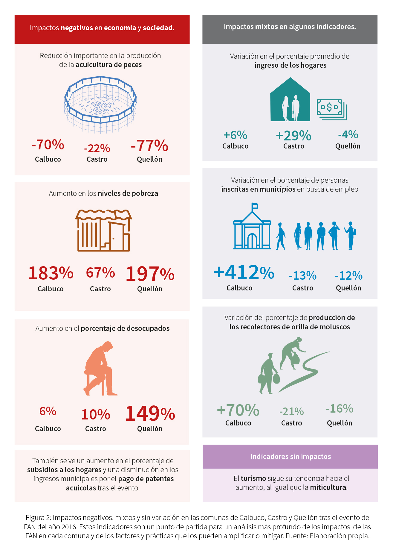 Los eventos que han afectado en los últimos años a esta zona, especialmente el ocurrido el año 2016, permiten ilustrar la complejidad y el encadenamiento de impactos que pueden generar estos fenómenos. La necesaria prohibición de extraer y consumir recursos marinos para evitar intoxicaciones repercute de manera sistémica en esta localidad, paralizando las industrias y afectando trabajos e ingresos económicos de muchas familias que se dedican a la pesca artesanal, la recolección de orilla y todo tipo de actividades asociadas al mar: