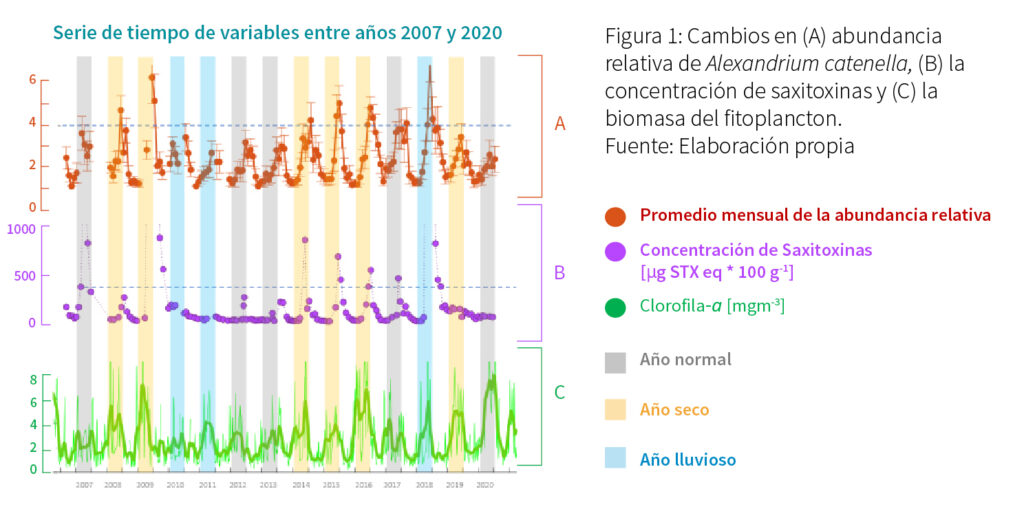 En el caso del sistema de canales y fiordos de la región de Aysén, las variaciones de la precipitación entre los años 2007 y 2019 coinciden con cambios en la abundancia de Alexandrium catenella (una especie conocida por causar eventos catastróficos de FAN en la zona) y también en la concentración de saxitoxinas (toxinas que esta especie produce). Por ejemplo, en años lluviosos (2010 y 2011) hubo una disminución de Alexandrium catenella y de saxitoxinas, así como también de la biomasa total de fitoplancton. Por el contrario, en años secos (2014 al 2016) la abundancia relativa de Alexandrium catenella muestra un claro incremento (ver Figura 1). Este hecho se ha relacionado con oscilaciones climáticas como el ENOS y el SAM, pues durante El Niño (fase cálida del ENOS) o bajo la fase positiva del SAM se registran menores precipitaciones en la Patagonia norte y con ello cambios en la abundancia de Alexandrium catenella.