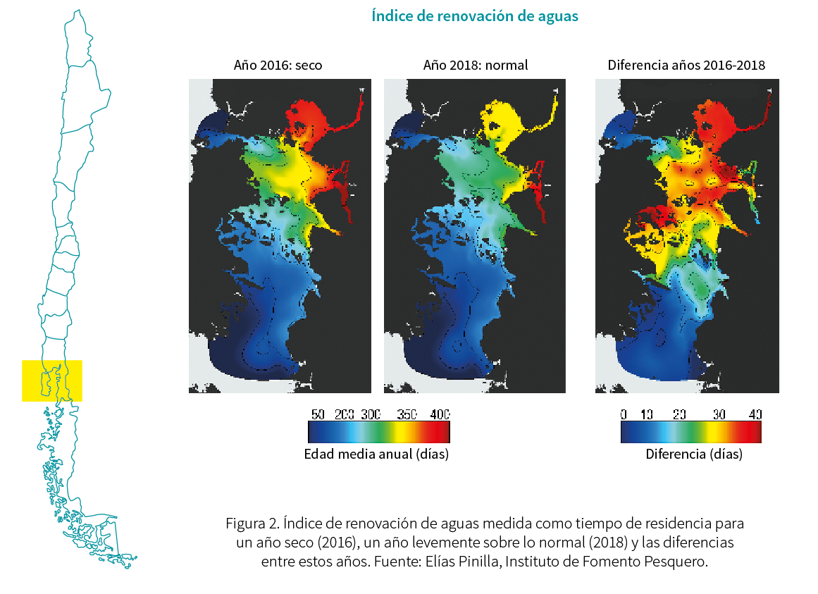La razón por la que los años secos favorecen la presencia de esta especie no se conoce completamente, pero se especula que obedece a que la descarga de agua dulce proveniente de los ríos y la escorrentía se reduce, generando una menor estratificación. Esto hace que los nutrientes de las aguas más profundas lleguen a la superficie y favorezcan el crecimiento del fitoplancton, aumentando la probabilidad de ocurrencia de FAN. Por otra parte, una menor descarga de agua dulce provoca una disminución de la circulación estuarina y un aumento en los tiempos de residencia de las aguas, especialmente en sistemas acuáticos semicerrados como canales y fiordos (Pinilla et al., 2020), lo que puede favorecer la permanencia de nutrientes, materia orgánica y contaminantes, generando condiciones favorables para la ocurrencia de eventos de FAN. De hecho, esto se evidenció en la Patagonia norte durante el año 2016 (Figura 2), uno de los años más secos de las últimas décadas y con mayor permanencia de las aguas, lo que provocó una menor renovación de estas.