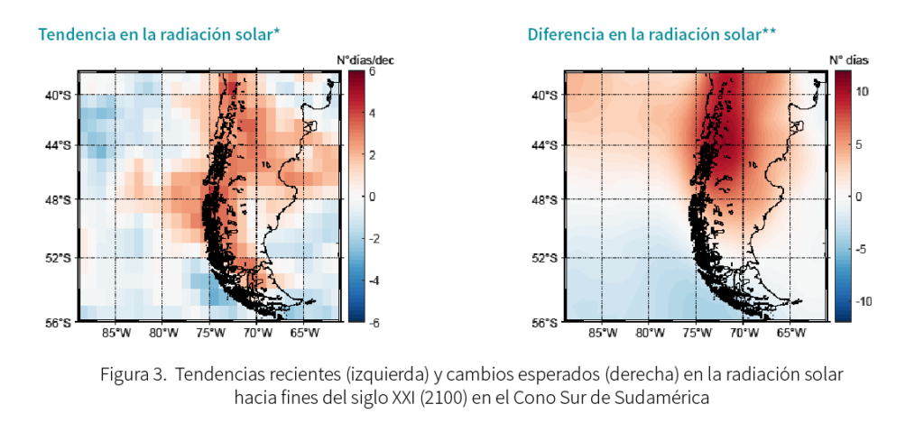 Los modelos y proyecciones climáticas globales indican que esta tendencia seguirá para fines de siglo y, por lo tanto, se espera que aumente la radiación solar (ver Figura 3), un factor que podría favorecer el desarrollo de las FAN.