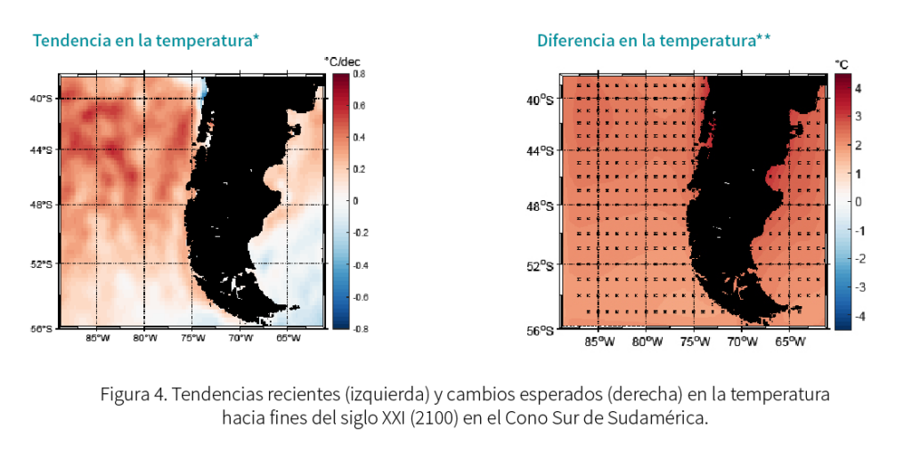 En tanto, en las últimas décadas, la temperatura superficial del mar, una variable clave para la ocurrencia de FAN, muestra un aumento sostenido cercano a los 0,5 °C por década en las regiones de Los Lagos y Aysén. Sin embargo, la tendencia es opuesta para la Región de Magallanes, con una disminución de -0,1 ºC por década. Como es de esperar, las proyecciones para fines de siglo muestran que el aumento continuará para toda la Patagonia chilena, con un incremento de 3 °C con respecto al clima actual, lo que también se verá, incluso, en Magallanes (ver Figura 4).