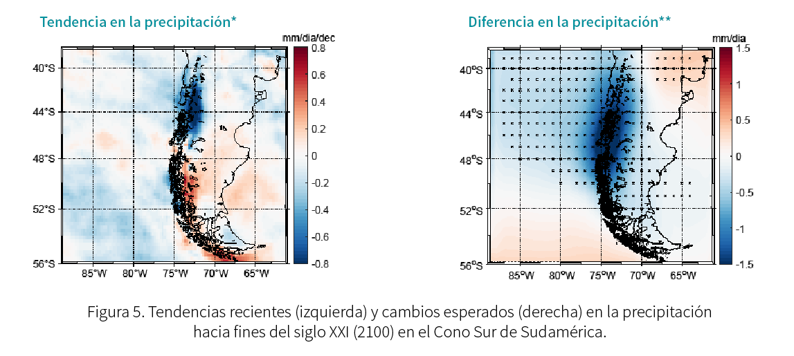 Respecto a las precipitaciones que ocurren durante la estación de verano, en los últimos 20 años (2000 – 2020) se ha observado una tendencia a la disminución en la Patagonia norte y centro, proyectándose una disminución robusta en las regiones de Los Lagos y Aysén (-20 %) para el 2100, lo que favorecería las FAN de especies como Alexandrium catenella. Por el contrario, en la región de Magallanes se proyecta un leve aumento en la cantidad de lluvias (5 %) hacia fines de siglo (ver Figura 5).
