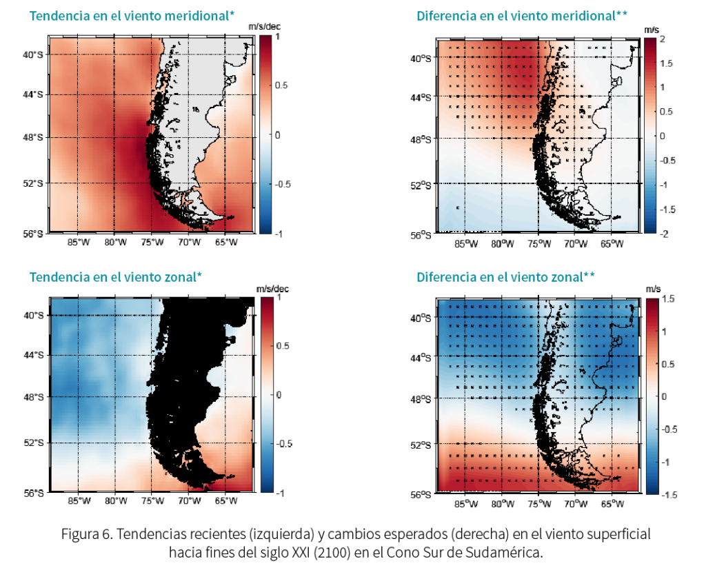 En relación al viento, se proyecta un aumento que favorecería a la surgencia costera frente a la Patagonia norte, patrón que continuaría para fines de siglo (2100). Por otro lado, las observaciones indican una tendencia de desplazamiento hacia el sur del cinturón de vientos del oeste en las últimas décadas (2000-2020), lo que se traduce en una disminución del viento de dirección Oeste a Este hasta aproximadamente la latitud 53°S, con un aumento de su intensidad en zonas más polares. Estas tendencias son consistentes con los patrones proyectados bajo un escenario de cambio climático, los cuales muestran que para finales de siglo se espera una disminución robusta del viento oeste en las regiones de Los Lagos y Aysén, y un aumento robusto en Magallanes (ver Figura 6).