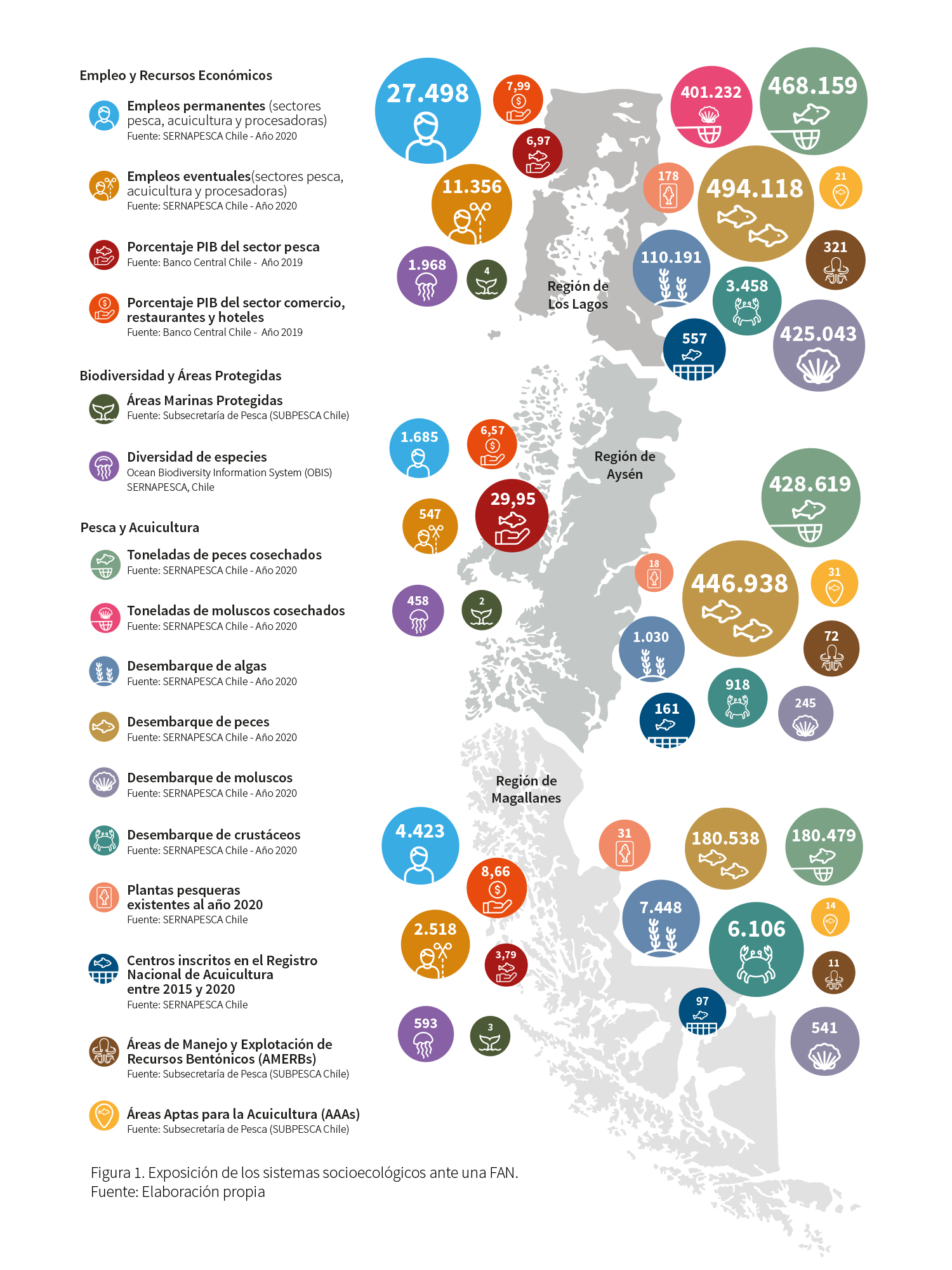 Sin embargo, el cambio en el modelo económico que supuso la llegada y expansión de la acuicultura industrial trajo consigo impactos tanto culturales -cambios en algunas tradiciones y saberes- como socioecológicos, deteriorando hábitats naturales y gatillando crisis socioambientales. Este escenario se ha vinculado con un potencial incremento en la ocurrencia, duración y expansión de las FAN, desde Magallanes a Los Lagos (Buschmann et al., 2006; Crawford, et al., 2021; Soto et al., 2021). En los últimos años, los impactos asociados a estos eventos, junto con la motivación por fortalecer tradiciones y saberes por parte de las comunidades costeras, ha llevado a la creación de movimientos socioambientales que buscan conservar los ecosistemas a través de un desarrollo sustentable y sostenible de la zona, con un reflejo en el incremento de las áreas protegidas a lo largo de la Patagonia (Sepúlveda & Lara, 2021).