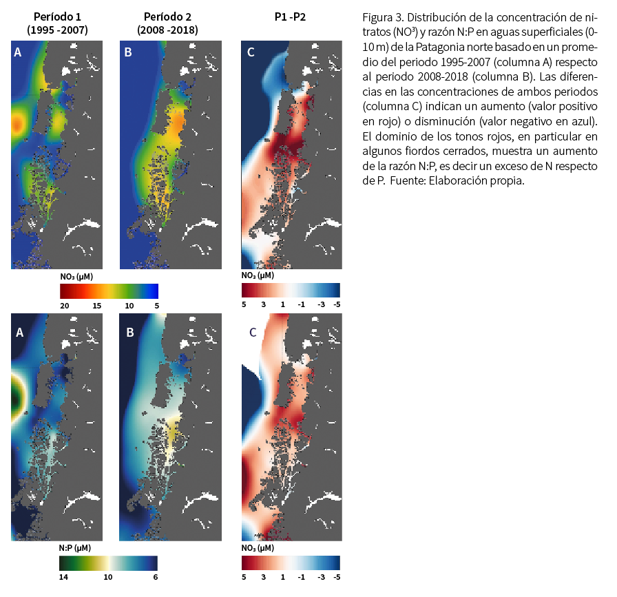 La incesante influencia de los vientos del oeste que cruzan la Patagonia resulta en copiosas precipitaciones (entre 3000 y 7000 mm/año) (Garreaud et al., 2013), las que, sumadas al aporte de agua dulce de origen glaciar, producen una alta escorrentía y descarga de ríos, que aportan silicatos y sedimentos hacia la zona costera (Iriarte, et al., 2014; González et al., 2019). La interacción entre el agua dulce continental y el agua salada oceánica, que ingresa principalmente por la boca del Guafo, el golfo de Penas y el canal Concepción, crea un sistema de circulación estuarina con marcados cambios de temperatura y salinidad que controlan la productividad biológica y la biomasa y estructura del fitoplancton que sustenta las pesquerías y acuicultura regional (ver Figura 2) (Iriarte et al., 2014; Cuevas et al., 2019; González et al., 2019; Pérez et al., 2021).