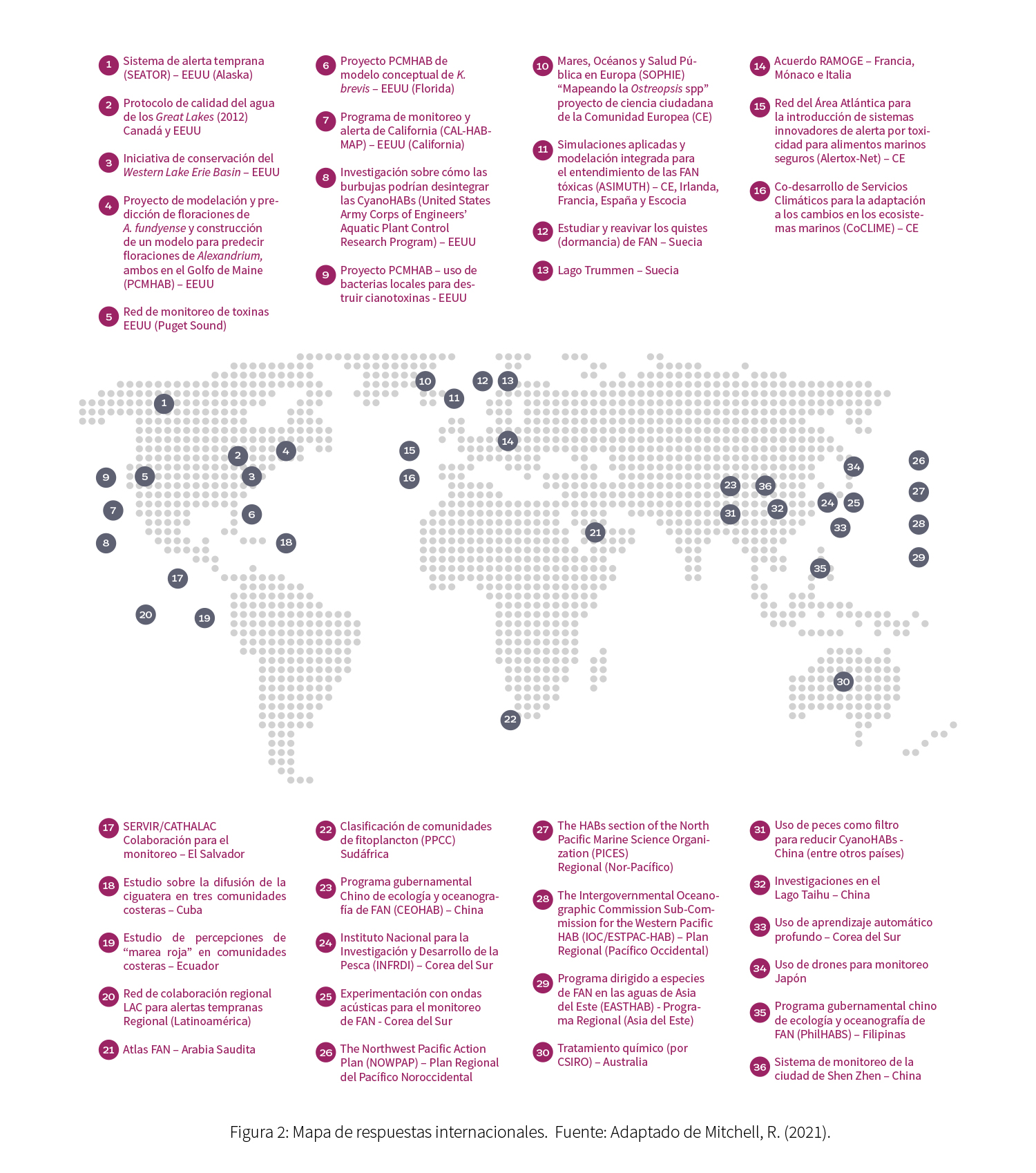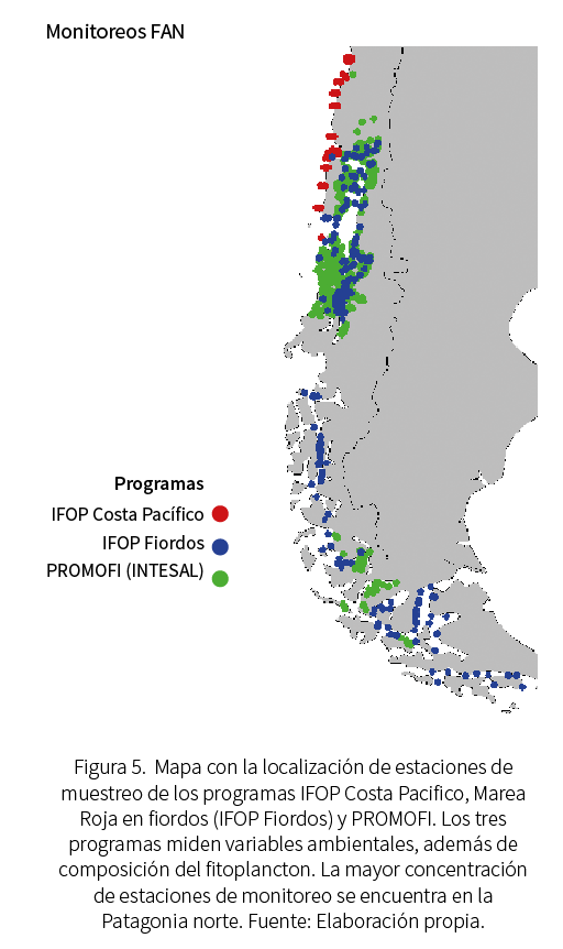 Chile es uno de los cuatro focos mundiales que tienden a desarrollar floraciones catastróficas dada la gran magnitud de los impactos que pueden provocar (Smayda, 2000). En nuestro país, las FAN han tenido un aparente incremento en las últimas décadas y se han concentrado mayormente en la zona sur-austral, en fiordos y canales de las regiones de Los Lagos, Aysén y Magallanes. Ante estos eventos, el Estado ha realizado importantes esfuerzos tanto a nivel sanitario como socioeconómico, principalmente mediante programas de monitoreo para salvaguardar vidas humanas y gestionar el manejo adecuado de los recursos marinos. Si bien estos esfuerzos han tenido resultados positivos previniendo intoxicaciones y muertes asociadas (Instituto de Salud Pública de Chile 2010, 2012, 2022), es importante mantener la vigilancia y mejorarla continuamente.