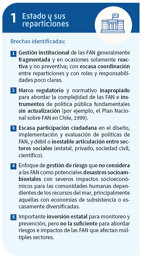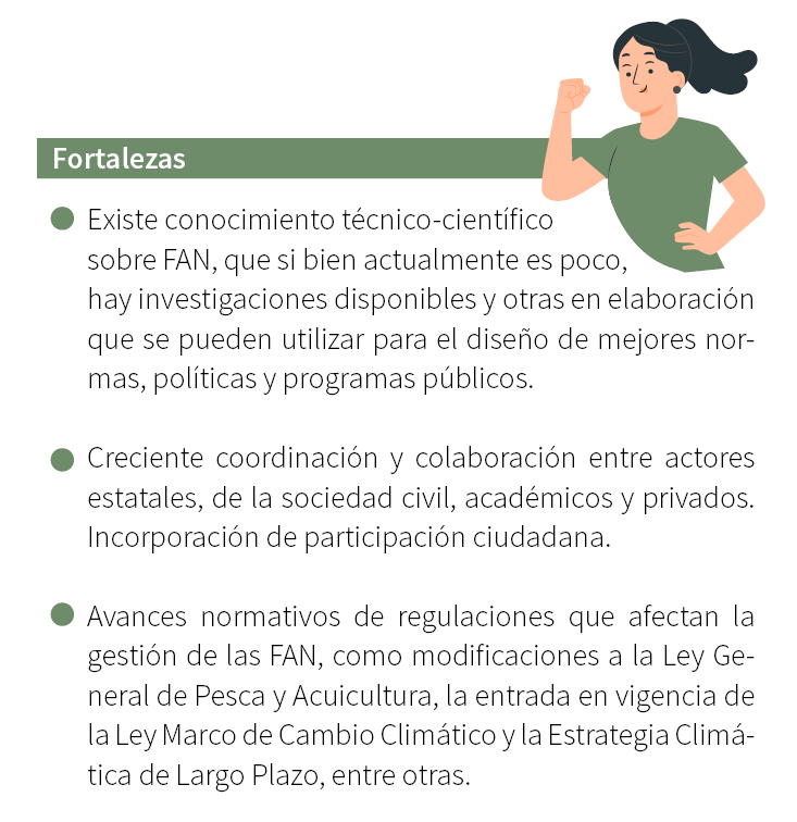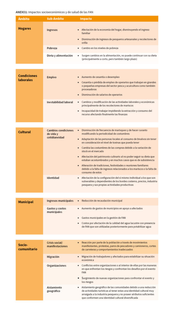 En este sentido, es importante reconocer y abordar anticipadamente los impactos de las FAN, sobre todo en localidades aisladas, altamente dependientes de los recursos bentónicos y donde no ha existido previamente una experiencia de FAN, pues las relaciones entre las personas, las organizaciones e instituciones pueden deteriorarse y gatillar situaciones de mayor conflictividad social. Obtener lecciones de los impactos observados es clave para aprender a convivir con las FAN de manera colaborativa.