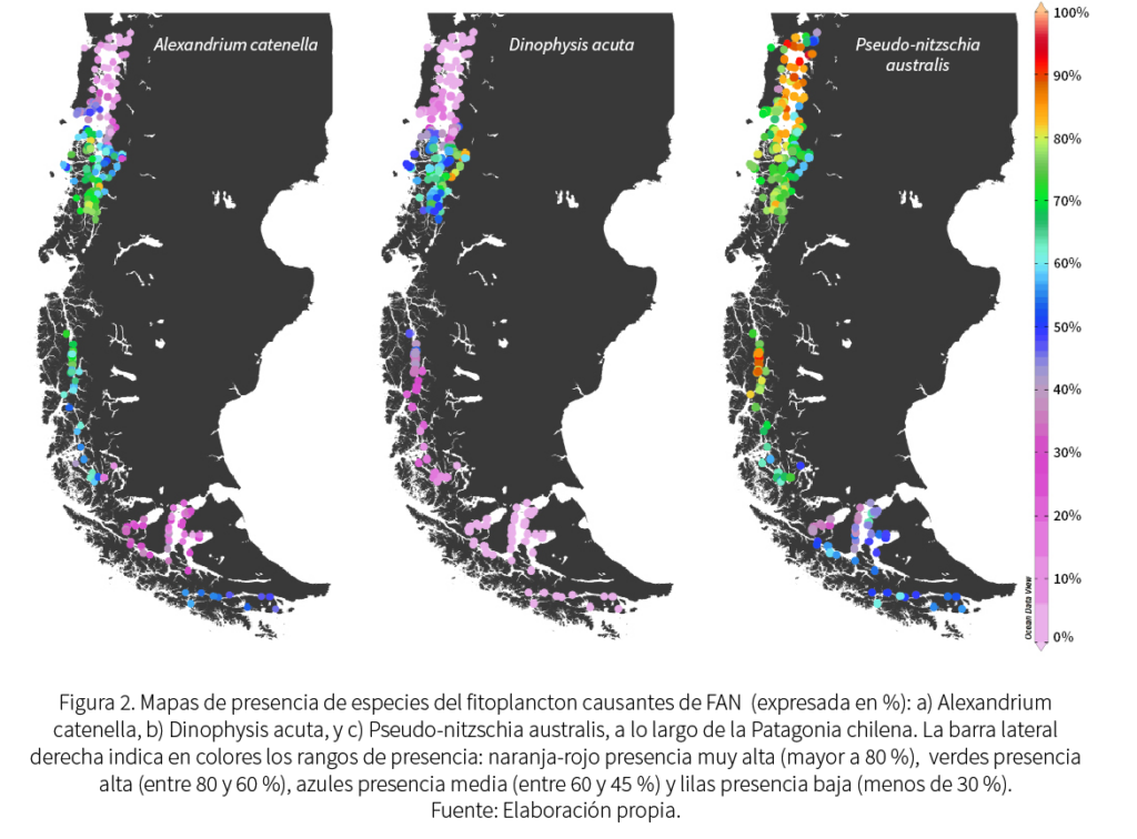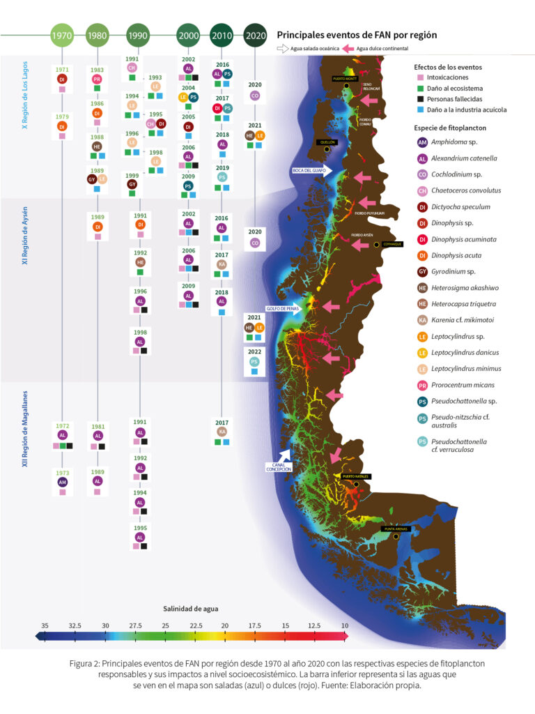 Las FAN, a lo largo del sistema costero-marino de fiordos y canales de la Patagonia chilena, son causadas por diferentes especies autóctonas del fitoplancton, principalmente diatomeas y dinoflagelados. Podemos mencionar Alexandrium catenella, Pseudo-nitzschia sp. y Dinophysis sp., entre otras (Alves de Souza et al., 2019; Crawford et al., 2021; Díaz et al., 2021), las cuales tienen efectos nocivos en la población humana y la fauna local.