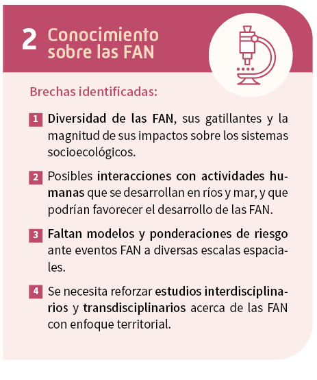 No obstante, aún es muy poco lo que se conoce respecto a las crisis sistémicas que pueden gatillar las FAN y los múltiples impactos en áreas como la salud mental de las comunidades costeras, la soberanía alimentaria y en la cultura de estas localidades. Lo anterior, es particularmente relevante cuando estos eventos se transforman en fenómenos crónicos que impiden el desarrollo de ciertas actividades y que, incluso, fuerzan a muchas personas a buscar nuevas fuentes de ingresos o incluso nuevos lugares para vivir.