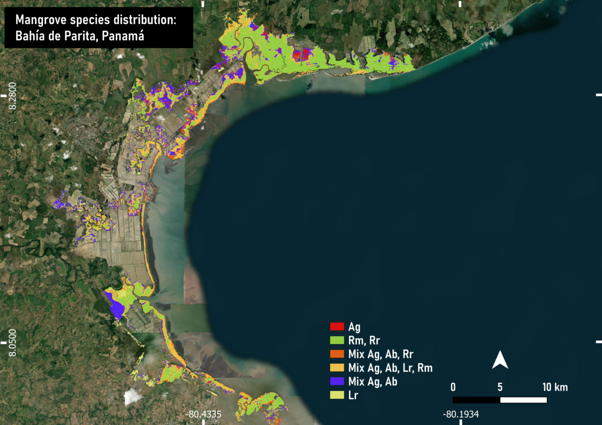 Our preliminary results suggest well-defined species distribution patterns with distinct carbon stocks across the Bay of Parita (Ag, Avicennia germinans; Rm, Rhizophora mangle; Rr, Rhizophora racemosa; Ab, Avicennia bicolor; Lr, Laguncularia racemosa). These analyses were conducted by Victor Hinojosa1,2, Juliana Chavarria3, José Miguel Guevara3, Alejandro Miranda1,4,5, Javier Lopatin4,6,7, María Alejandra Bravo6, and Jorge Hoyos-Santillan1,3,4. Our results, together with NASA GEDI data, Planet Satellite Imagery, and field data will contribute to improve the current estimations of aboveground and belowground carbon stocks in Panama’s mangroves. The scope of this study could readily extend to a national level (~ 178,000 ha) based on the several existing maps of mangrove cover in Panama.