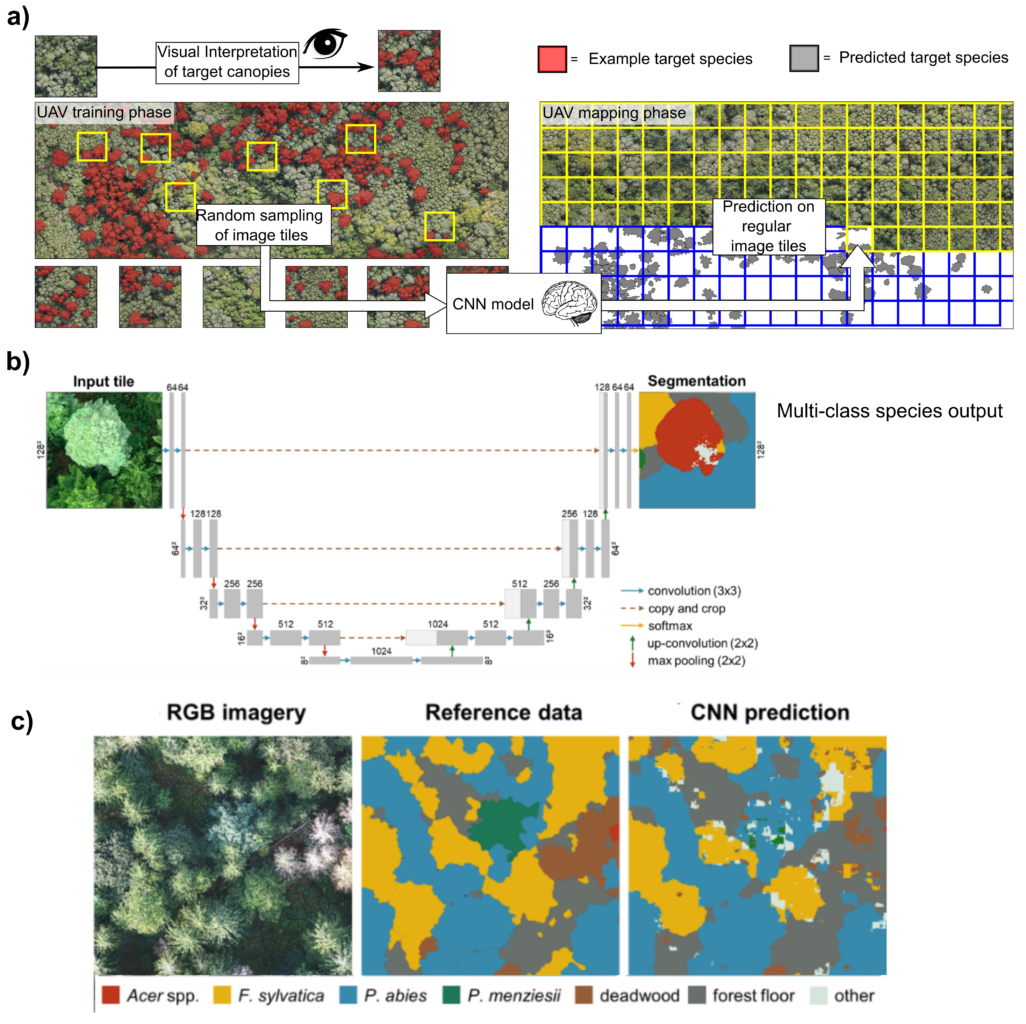 Estimating the carbon baseline is one of the first steps towards carbon-focused management, conservation, and restoration of mangroves. To develop the most detailed carbon baseline possible to support Panama’s climate ambition adequately, we have been conducting a collaborative effort to map the spatial distribution of different mangrove communities in the Bay of Parita and the Bay of Panama over the past year (e.g., Fig. 1) through the Blue Natural Heritage project. Our experimental approaches include traditional supervised classification parallel to cutting-edge alternatives for high spatial resolution remote sensing analyses, such as semantic segmentation using convolutional neural networks (CNN). The later approach comprises the photo interpretation of high-spatial-resolution images to delineate canopies of the target mangrove species (Figure 2a). These masks are used as references to train a CNN algorithm, like U-Net or DenseNet (Figure 2b). The results are supervised segmentations with a multi-class classification output (Figure 2c). These methods are revolutionary as they learn from the images’ reflectance values, texture, and context.
