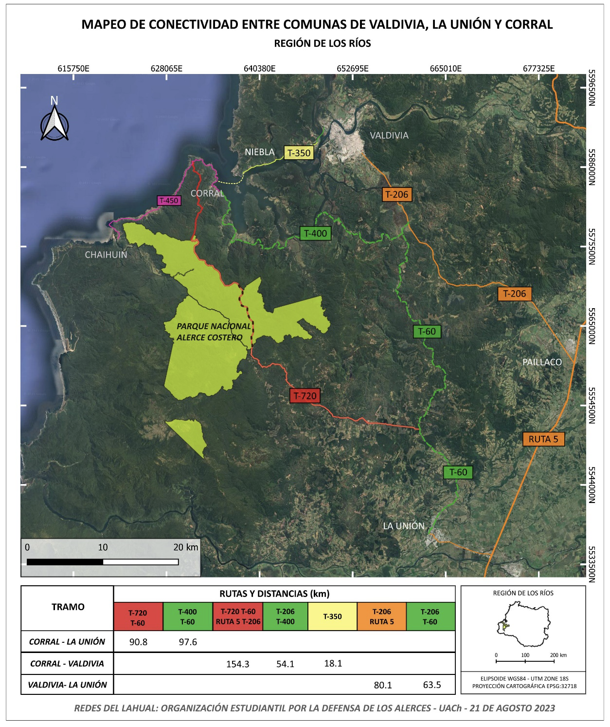 - The sum of Routes T-60 and T-400 implies only a seven-kilometer increase in the distance between La Unión and Corral compared to Route T-720 and would generate three positive impacts: a. Better connectivity through a paved road between both communes and between them and the regional capital; b. Local tourism would be boosted as it borders the Futa River and also the transport of supplies; c. The impact on high-priority conservation ecosystems currently protected by the Alerce Costero National Park would be avoided.