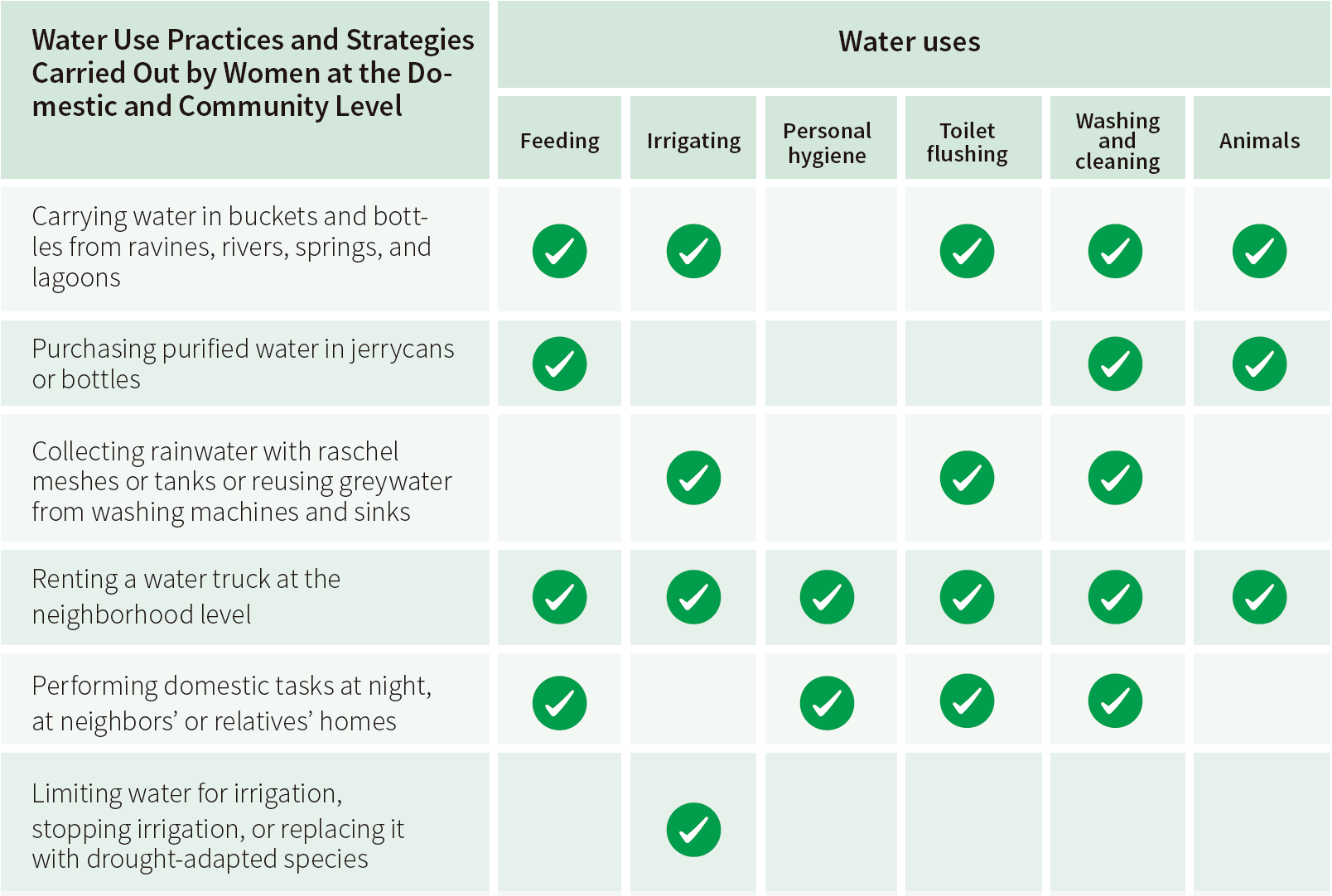 - Progress must be made in research and collecting gender-disaggregated data to assess local water insecurity gaps, prioritizing the most vulnerable rural sectors. Strengthening research on the impacts of water scarcity on women and exploring the consequences for men and LGBTTTIQ+ people is crucial.