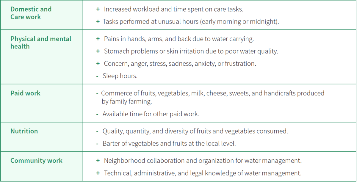 Table 1 shows the consequences generated by water insecurity in the different areas of women’s daily life: