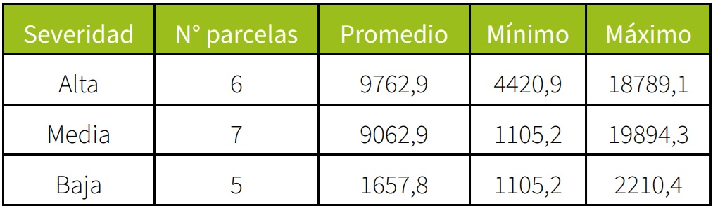 Analyses revealed a direct relationship between fire severity and the degree of invasion by P. radiata. In high-severity sites, the average density of this species reached 9,760 individuals per hectare five years after the fire (Table 1, Figure 1). This pattern suggests that the original vegetation has undergone drastic changes in composition and structure, due both to canopy tree mortality and the high density of the invasive species. As a result, the ecosystem’s natural recovery process is being severely impacted due to intense competition for critical resources in the early stages of forest development.