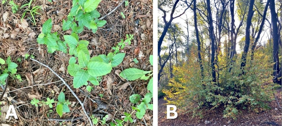 Figure 2. Types of post-fire regeneration in N. alessandrii: (A) from seeds and (B) through vegetative sprouting.