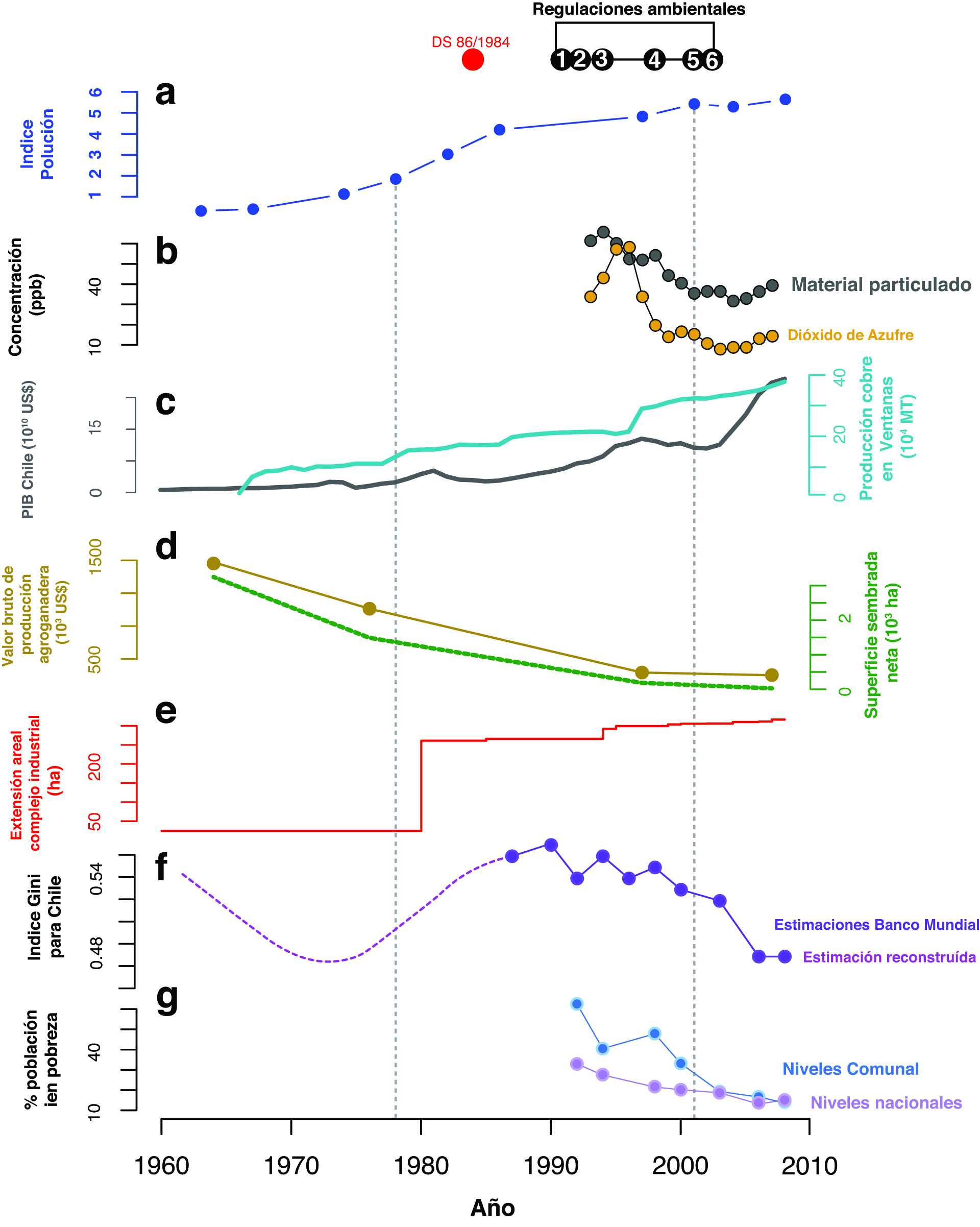 A significant presence and diversification of industrial activities in Puchuncaví generated an exponential increase in pollution, given in part by Supreme Decree (DS) 86/1984 that modifies the Valparaíso Intercommunal Plan. Meanwhile, its population economy had a marginal increase since local poverty levels have been comparatively higher than national rates (Figure 3). Added to this is the loss of traditional economic activities in the area, for example, agriculture, whose presence decreased due to the adverse effects of pollution.
