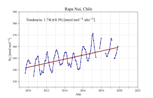 Recent estimates indicate that atmospheric hydrogen abundance has increased by 70% compared to preindustrial levels due to anthropogenic activities (Patterson et al., 2021). Global observations also show hydrogen increases during the 2010-2019 period (Paulot et al., 2024). Furthermore, Figure 1 demonstrates an upward trend for hydrogen in remote areas of Chile (Rapa Nui) and Argentina (Ushuaia).