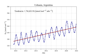 Figure 1. Molecular hydrogen trend in remote regions of the South Pacific (left) and Patagonia (right) based on monthly averages. In Rapa Nui and Ushuaia, an annual increase of approximately 2 nmol mol-1 is observed, representing a total accumulated increase of 18 nmol mol-1 over a decade. Measurements conducted by NOAA’s Global Monitoring Laboratory (USA).