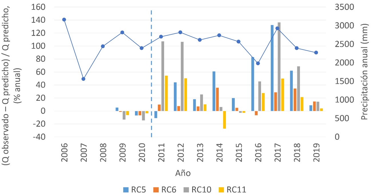 Figure 2. The colored bars represent the flow (in millimeters) in each of the study basins. The vertical dotted line represents the felling of the eucalyptus trees between January and April 2011. You can see the increase in flows from that year onwards. The horizontal line represents (at a percentage level) the difference between the observed flow and the one predicted from the rainfall in the period 2009-2011. Source: Modified from Lara et al. (2021).