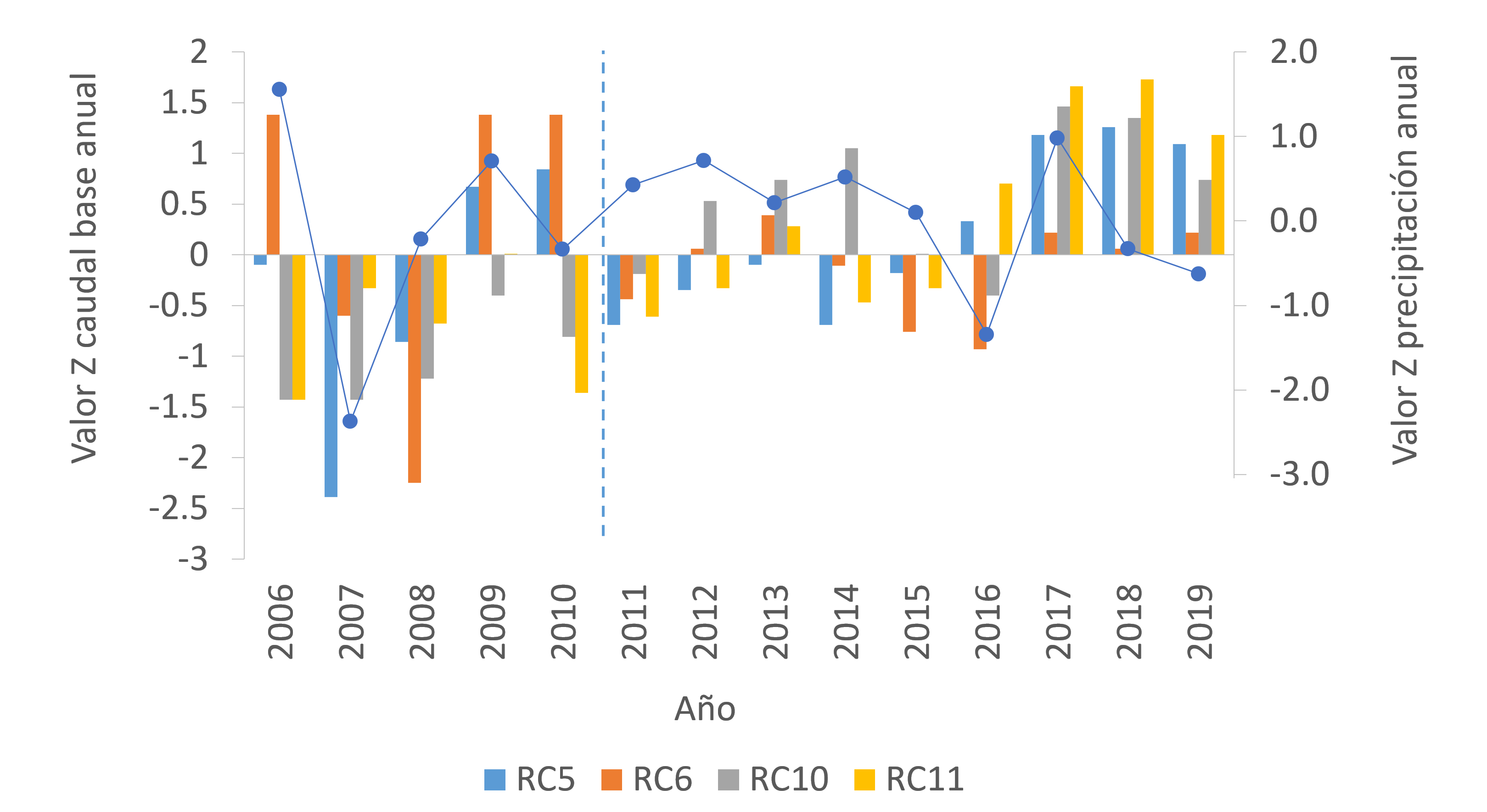 Figure 3. Variation of annual base flows (bars) and precipitation (line), both expressed as standardized deviations. The vertical segmented line shows the clearcut of the eucalyptus plantation and the beginning of the restoration in 2011. It can be seen that the base flow began to increase from the year 2017 onwards, which would mean that the water content started to recover in the ground. Source: Modified from Lara et al. (2021).