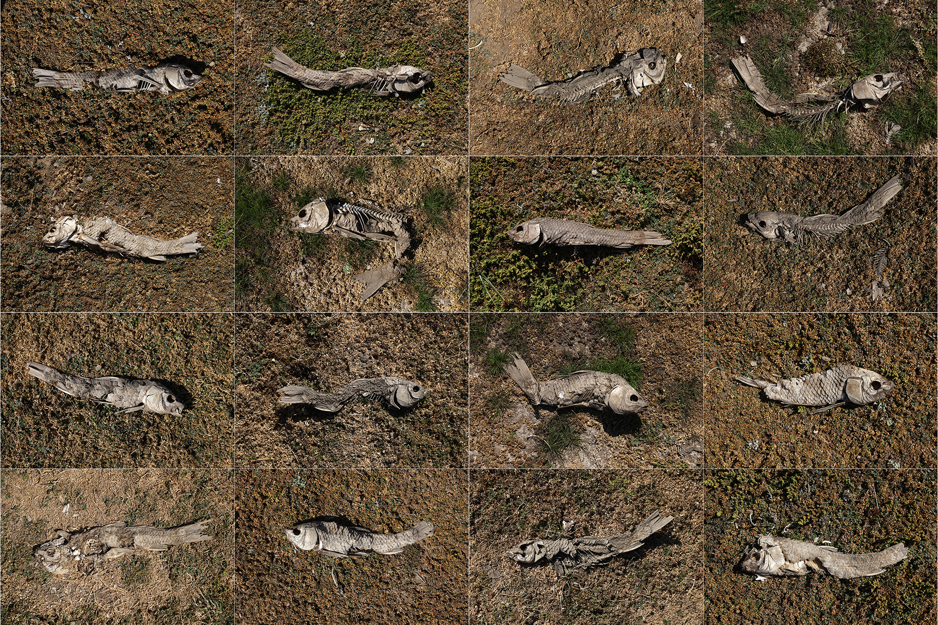 A huge expanse of dried and cracked earth that was once the lake bed is littered with fish skeletons and desperate animals searching for water.