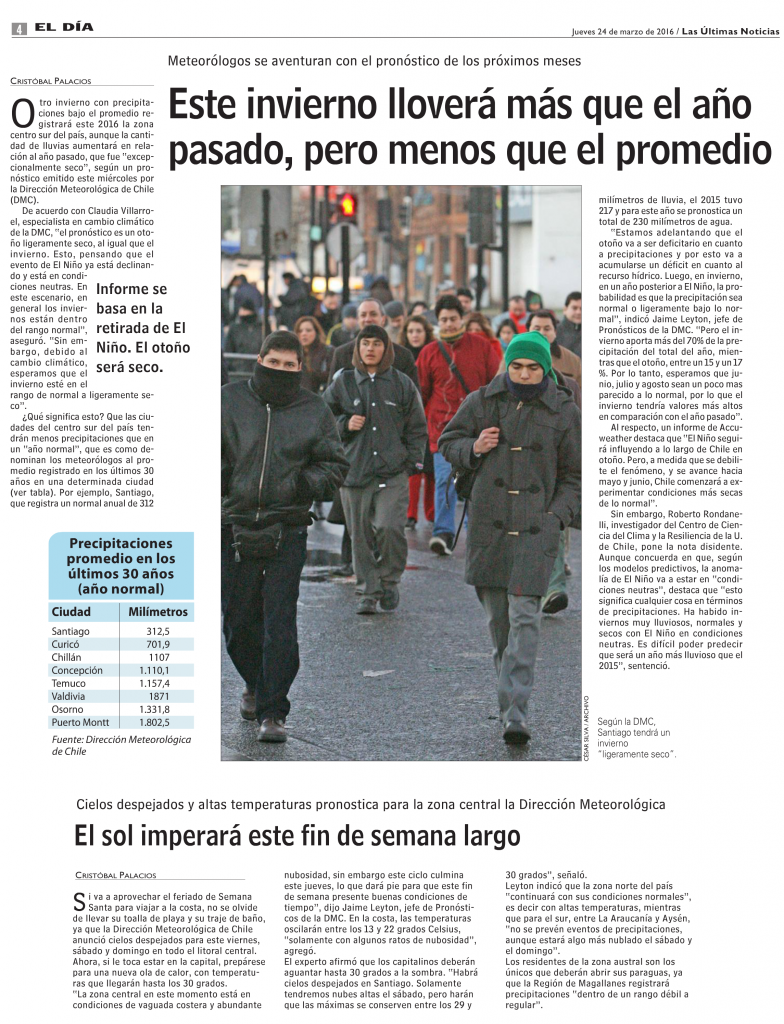 Agua y ExtremosZona costera Este invierno lloverá más que el año pasado, pero menos que el promedio (Las Últimas Noticias) 24 de marzo de 2016 2185 Leer en Las Últimas Noticias
