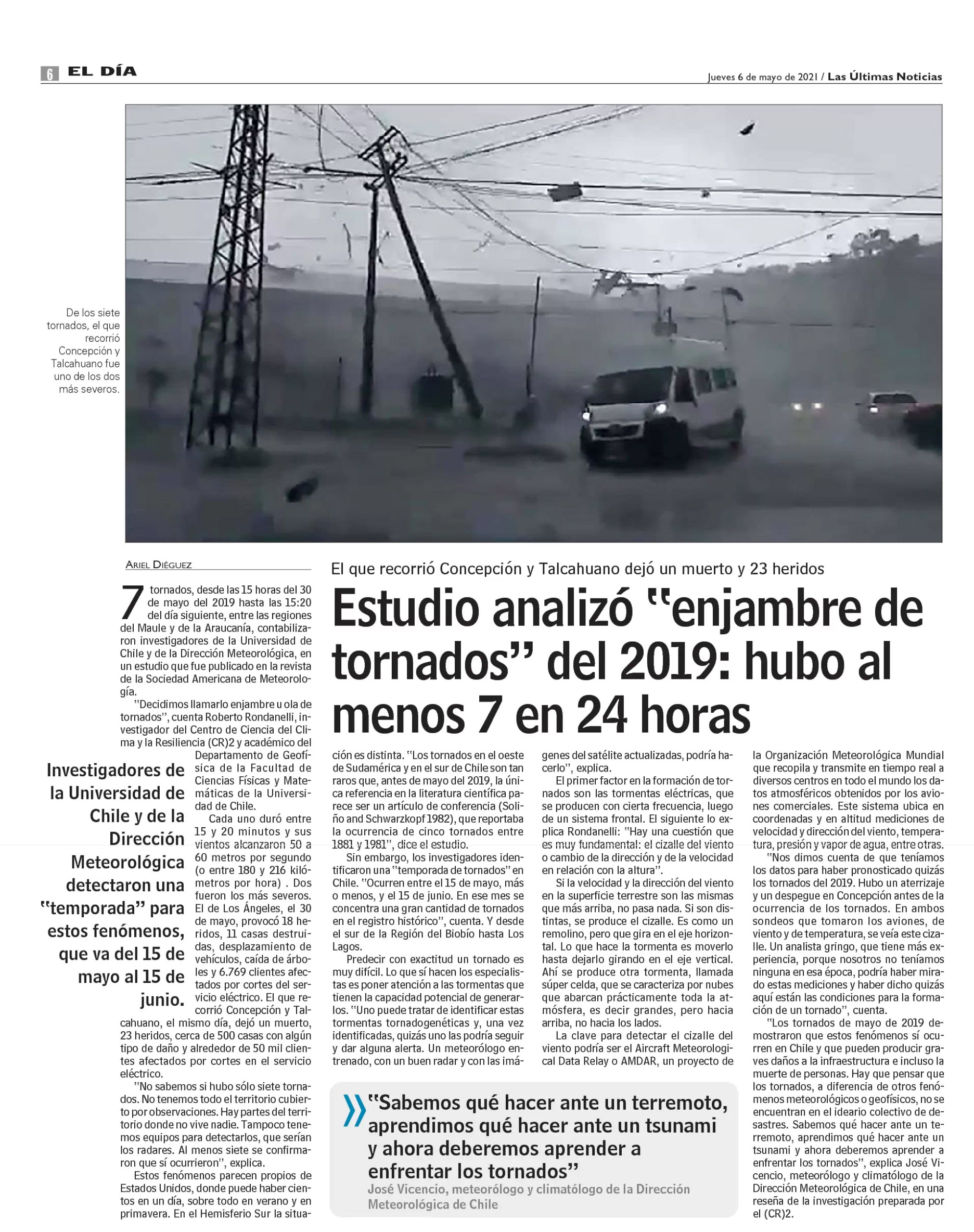 7 tonados, desde las 15 horas del 30 de mauo del 2019 hasta las 15:20 del día siguiente, entre las regiones del Maule y de la Araucanía, contabilizaron investigadores de la Universidad de Chile y de la Dirección Meteorológica, en un estudio que fue publicado en la revista de la Sociedad Americana de Meteorología.