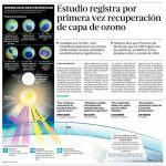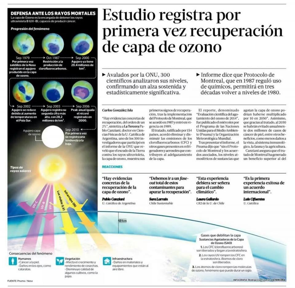 “Hay evidencias concretas de recuperación, del orden de un 2%”, sintetiza a La Tercera Pablo Canziani, doctor en Ciencias Físicas de la U. Católica de Argentina, uno de los 300 investigadores que participó en el informe de la ONU que reveló que el escudo de la Tierra contra los rayos ultravioleta, la capa de ozono, muestra sus primeros signos de recuperación, tras la implementación del Protocolo de Montreal, que se acordó en 1987 y entró en vigencia en 1989.