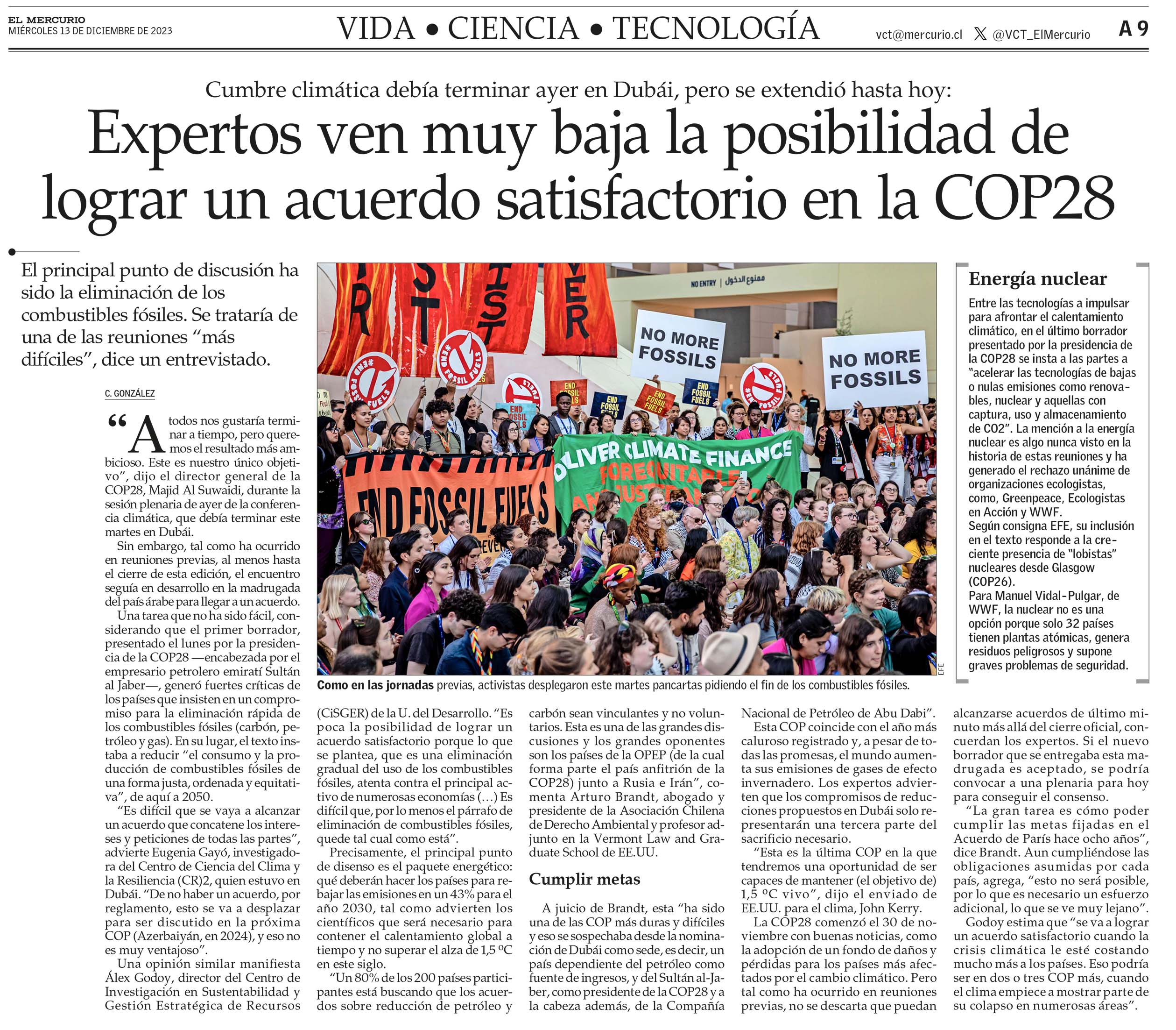 “Es difícil que se vaya a alcanzar un acuerdo que concatene los intereses y peticiones de todas las partes”, advierte Eugenia Gayó, investigadora del Centro de Ciencia del Clima y la Resiliencia (CR)2, quien estuvo en Dubái. “De no haber un acuerdo, por reglamento, esto se va a desplazar para ser discutido en la próxima COP (Azerbaiyán, en 2024), y eso no es muy ventajoso”.