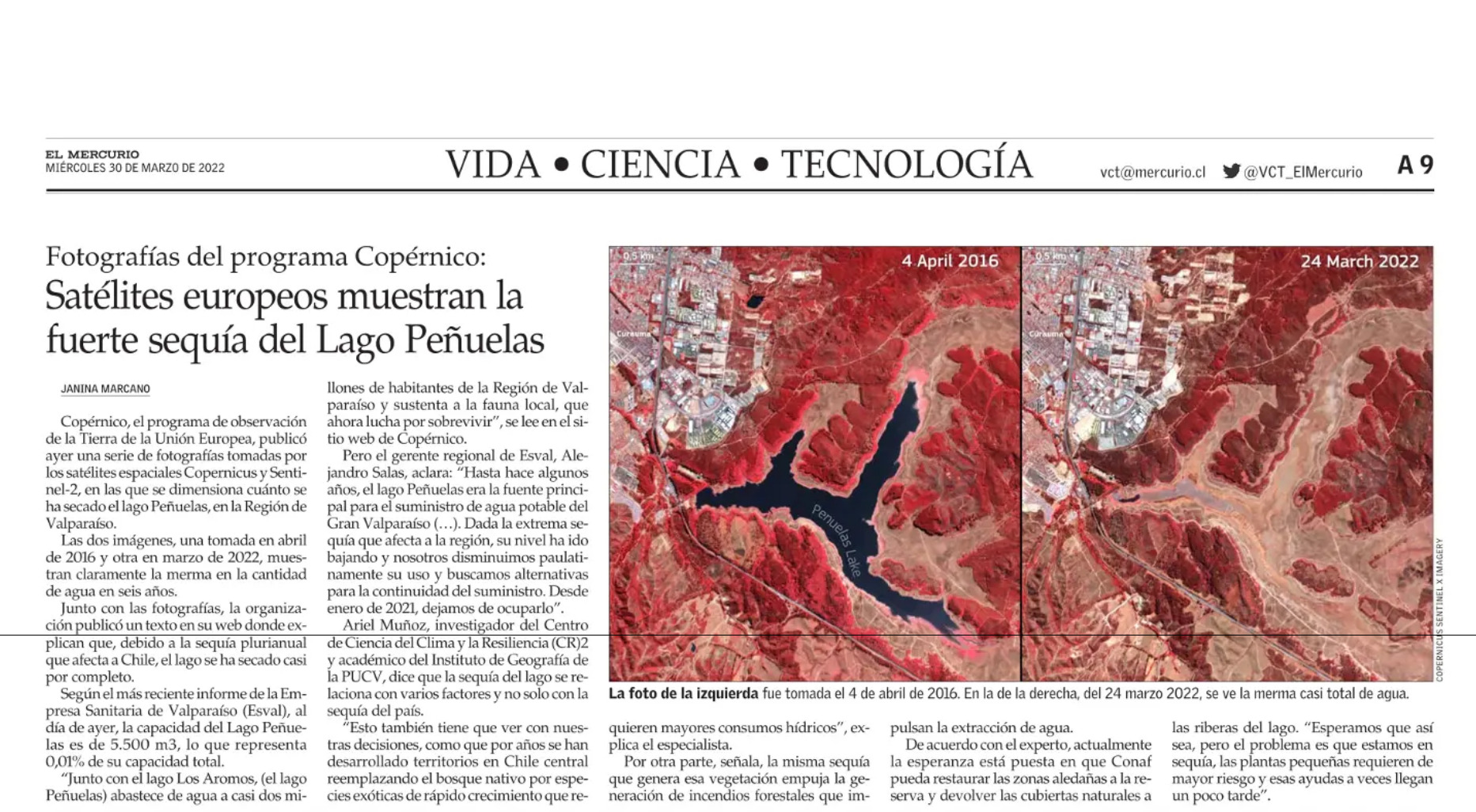 Fotografías del programa Copérnico: Satélites europeos muestran la fuerte sequía del Lago Peñuelas (El Mercurio)