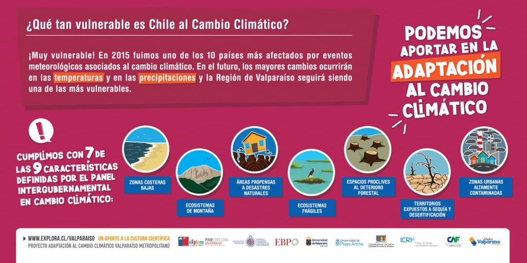 En un trabajo en conjunto con distintas instituciones y centros de investigación del país, se desarrollaron ocho gigantografías que entregan información sobre los procesos que se están viendo afectados por el cambio climático y los aportes que podemos hacer para adaptarnos a éste. Las imágenes estarán disponibles en todas las estaciones del Metro de Valparaíso.