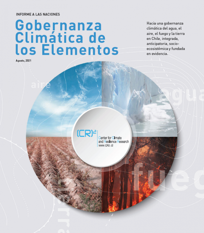 El Centro de Ciencia del Clima y la Resiliencia (CR)2 busca ser un aporte a la sociedad desarrollando diferentes iniciativas para que los conocimientos recabados por sus investigadores lleguen a todos los habitantes de este país. En este contexto se desarrolla el Informe a las Naciones «Gobernanza Climática de los Elementos» que propone un nuevo modelo de gobernanza socioambiental orientado a responder a los desafíos que nos depara el cambio climático, ofreciendo un diagnóstico de la gobernanza actualmente existente en el país en relación con los cuatros elementos (agua, aire, fuego, tierra) y lineamientos de política pública para avanzar hacia una Gobernanza Climática de los Elementos más integrada, efectiva, coordinada, inclusiva, legítima, oportunidad, fundada en un enfoque anticipatorio, territorial, socioecosistémico y de buena administración.